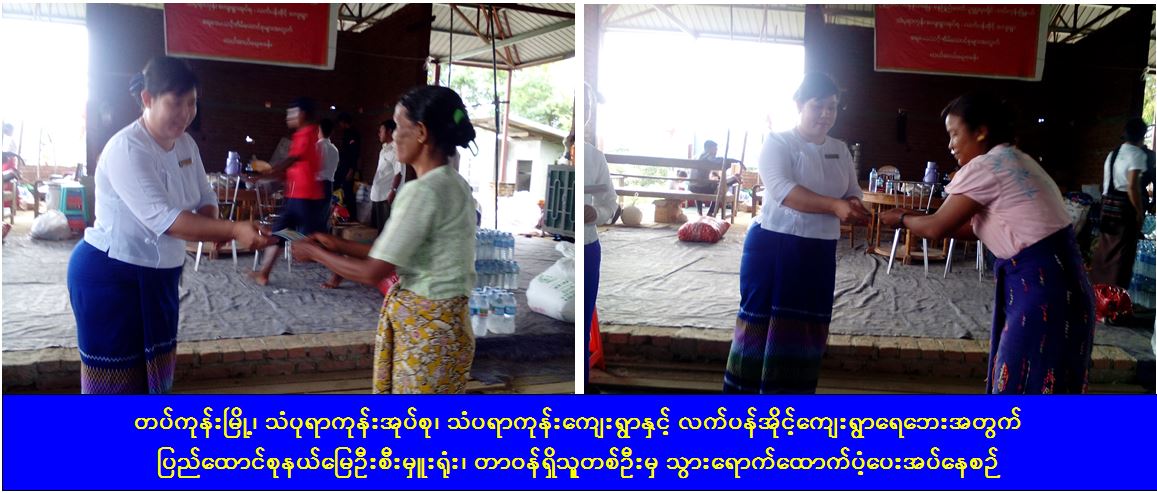 (၂၆.၈.၂၀၁၆)ရက်နေ့တွင် ဖြစ်ပွားခဲ့သော တပ်ကုန်းမြို့၊ သံပုရာကုန်းအုပ်စု၊ သံပရာကုန်းကျေးရွာနှင့် လက်ပန်အိုင့်ကျေးရွာရေဘေးတွင် ရေဝင်ရောက်ခဲ့သောအိမ်ထောင်စု (၂၃၁) စုအတွက် အိမ်ဆောက်ပစ္စည်းဖိုးငွေ တစ်အိမ်လျှင် (၂၀,၀၀၀/-)ကျပ်နှုန်းဖြင့် စုစုပေါင်း ငွေ(၄,၆၂၀,၀၀၀/-) ကျပ် အား လက်ပန်အိုင့်ကယ်ဆယ်ရေးစခန်းသို့ (၃၁.၈၂၀၁၆)ရက်နေ့တွင် ပြည်ထောင်စုနယ်မြေဦးစီးမှူးရုံးမှ သွားရောက်ထောက်ပံ့ပေးအပ်ခဲ့ကြောင်း သတင်းရရှိပါသည်။