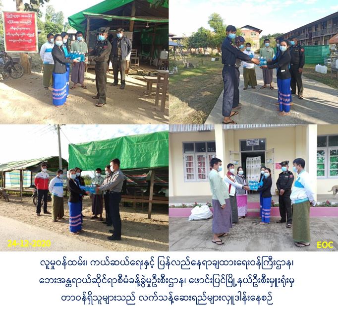 လူမှုဝန်ထမ်း၊ ကယ်ဆယ်ရေးနှင့် ပြန်လည်နေရာချထားရေးဝန်ကြီးဌာန၊ ဘေးအန္တရာယ်ဆိုင်ရာစီမံခန့်ခွဲမှုဦးစီးဌာန၊ ဖောင်းပြင်မြို့နယ်ဦးစီးမှူးရုံးမှ တာဝန်ရှိသူများသည် (၂၄-၁၂-၂၀၂၀)ရက်နေ့ (၁၅:၃၀)နာရီအချိန်တွင် ဖောင်းပြင်မြို့နယ် COVID-19 ထိန်းချုပ်ရေးနှင့် အရေးပေါ်တုံ့ပြန်ရေးကော်မတီအတွက် Hand Sanitizer (500ml) (၁၂၀)ဘူး၊ မြို့နယ်ပြည်သူ့ဆေးရုံ အတွက် Hand Sanitizer (500ml) (၅၀)ဘူး၊ အ. ထ. က(ဖောင်းပြင်) Quarantine Center အတွက် Hand Sanitizer (500ml) (၁၀)ဘူး၊ မြို့အဝင် ကျန်းမာရေးစစ်ဆေးရေးဂိတ်အတွက် Hand Sanitizer (500ml) (၁၀)ဘူးနှင့် မြို့အထွက် ကျန်းမာရေးစစ်ရေးဂိတ်အတွက် Hand Sanitizer (500ml) (၁၀)ဘူး၊ စုစုပေါင်းလက်သန့်ဆေးရည် (၂၀၀)ဘူးအား မြို့နယ်အုပ်ချုပ်ရေးမှူး၊ မြို့နယ်စီ/ခန့် အဖွဲ့ဝင်များနှင့်အတူ သွားရောက်ထောက်ပံ့ပေးအပ်ခဲ့ပါ ကြောင်း သတင်းရရှိပါသည်။