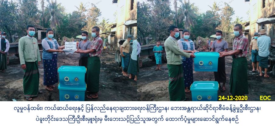 လူမှုဝန်ထမ်း၊ ကယ်ဆယ်ရေးနှင့် ပြန်လည်နေရာချထားရေးဝန်ကြီးဌာန၊ ဘေးအန္တရာယ်ဆိုင်ရာစီမံခန့်ခွဲမှုဦးစီးဌာန၊ ပဲခူးတိုင်းဒေသကြီးဦးစီးမှူးရုံးမှ တာဝန်ရှိသူများသည် (၂၃-၁၂-၂၀၂၀) ရက်နေ့၌ ပဲခူးခရိုင်၊ ဒိုက်ဦးမြို့နယ်၊ ဒရယ်မီးရပ်ကွက်၊ မကျည်းတန်းလမ်းတွင် ဖြစ်ပွားခဲ့သော မီးဘေးကြောင့် မီးဘေးသင့်ပျက်စီးနေအိမ်(၂)လုံးအတွက် အိမ်ဆောက်ပစ္စည်းဖိုး ထောက်ပံ့ငွေ(၄၀၀၀၀၀/-)ကျပ်၊ လူဦးရေ(၉)ဦးတို့အတွက် ဆန်ရိက္ခာ(၇)ရက်စာဖိုးထောက်ပံ့ငွေ (၁၈၉၀၀/-)ကျပ် စုစုပေါင်း ထောက်ပံ့ငွေ(၄၁၈၉၀၀/-) ကျပ်နှင့်ကယ်ဆယ်ရေးပစ္စည်း(၁၉)မျိုး(၂) အိမ် ထောင်စာတို့အား (၂၄-၁၂-၂၀၂၀) ရက်နေ့ (၁၆:၄၅) နာရီအချိန်တွင် ဘေးသင့်ပြည်သူများထံသို့ လက်ဝယ်အရောက် သွားရောက်ထောက်ပံ့ပြီးဖြစ်ပါကြောင်း သတင်းရရှိပါသည်။