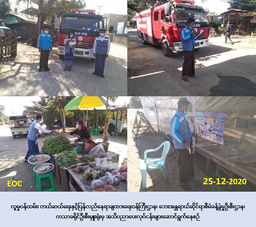 လူမှု၀န်ထမ်း၊ ကယ်ဆယ်ရေးနှင့် ပြန်လည်နေရာချထားရေး၀န်ကြီးဌာန၊ ဘေးအန္တရာယ်ဆိုင်ရာ စီမံခန့်ခွဲမှုဦးစီးဌာန၊ ကသာခရိုင်ဦးစီးမှူးရုံးမှ တာဝန်ရှိသူများသည် (၂၅-၁၂-၂၀၂၀) ရက်နေ့၊ (၁၁း၃၀) နာရီမှ (၁၃း၀၀) နာရီအချိန်ထိ ဗန်းမောက်မြို့ပေါ်ရပ်ကွက်များနှင့် ကျေးရွာများရှိ ပြည်သူလူထုအား COVID-19 ကူးစက်ရောဂါနှင့်ပတ်သက်၍ အသိပညာပေးလုပ်ငန်းများ ဆောင်ရွက်ခဲ့ပြီး မီးဘေးလက်ကမ်းစာစောင်နှင့် ငလျင်ဘေးလက်ကမ်းစာစောင်များ ဖြန့်ဝေခဲ့ကြောင်း သတင်းရရှိပါသည်။