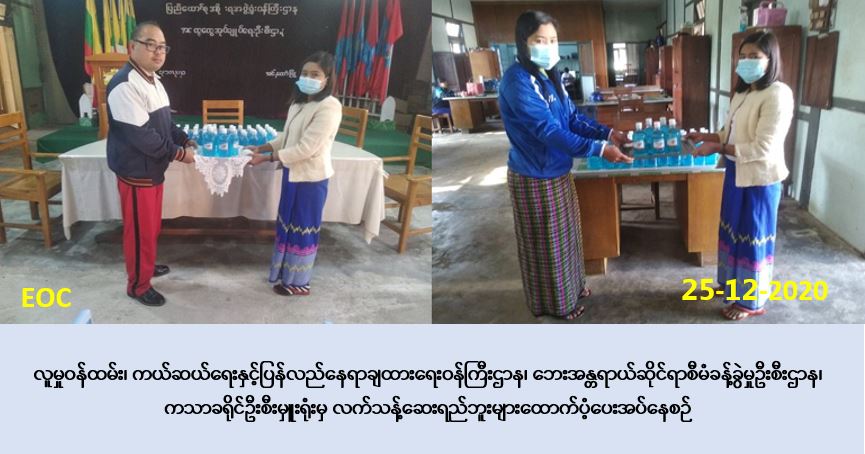 လူမှု၀န်ထမ်း၊ ကယ်ဆယ်ရေးနှင့် ပြန်လည်နေရာချထားရေး၀န်ကြီးဌာန၊ ဘေးအန္တရာယ်ဆိုင်ရာ စီမံခန့်ခွဲမှုဦးစီးဌာန၊ ကသာခရိုင်ဦးစီးမှူးရုံးမှ တာဝန်ရှိသူများသည် (၂၅-၁၂-၂၀၂၀) ရက်နေ့၊ (၀၈း၀၀) နာရီအချိန်တွင် အင်းတော်မြို့နယ် COVID-19 ကာကွယ်၊ထိန်းချုပ်၊ကုသရေး ကော်မတီသို့ လက်သန့်ဆေးရည်ဘူး (၆၀) ဘူးနှင့် (၁၁း၀၀) နာရီအချိန်တွင် ဗန်းမောက်မြို့နယ် COVID-19 ကာကွယ်၊ထိန်းချုပ်၊ကုသရေးကော်မတီသို့ လက်သန့်ဆေးရည်ဘူး (၆၀) တို့အား ထောက်ပံ့ပေးအပ်ခဲ့ကြောင်း သတင်းရရှိပါသည်။