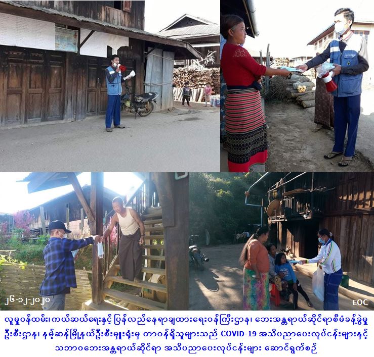 လူမှုဝန်ထမ်း၊ ကယ်ဆယ်ရေးနှင့် ပြန်လည်နေရာချထားရေးဝန်ကြီးဌာန၊ ဘေးအန္တရာယ်ဆိုင်ရာစီမံခန့်ခွဲမှုဦးစီးဌာန၊ နမ့်ဆန်မြို့နယ်ဦးစီးမှူးရုံးမှ တာဝန်ရှိသူများသည် အထွေထွေအုပ်ချုပ်ရေးဦးစီးဌာန၊ ကျေးရွာအုပ်ချုပ်ရေးမှူးတို့နှင့် ပူးပေါင်း၍ (၂၆-၁၂-၂၀၂၀) ရက်နေ့တွင် ပလောင်ကိုယ်ပိုင်အုပ်ချုပ်ခွင့်ရဒေသ၊ နမ့်ဆန်မြို့နယ်၊ ဘုရားကြီးကျေးရွာအုပ်စု၊ ဇယ်ဘန်ကောက်ကျေးရွာ၌ Covid-19 ဒုတိယလှိုင်းကာလအတွင်း ပြည်သူများ လိုက်နာရမည့်ကျန်းမာရေးအမူအကျင့်များ အသိပညာပေးခြင်းနှင့် သဘာဝဘေးဆိုင်ရာ အသိပညာပေးခြင်း၊ ပါးစပ်နှင့်နှာခေါင်းစည်း (Mask) များနှင့် အသိပညာပေးလက်ကမ်းစာစောင်များ ဖြန့်ပေးဝေခြင်းတို့အား ဆောင်ရွက်ခဲ့ကြောင်း သတင်းရရှိပါသည်။