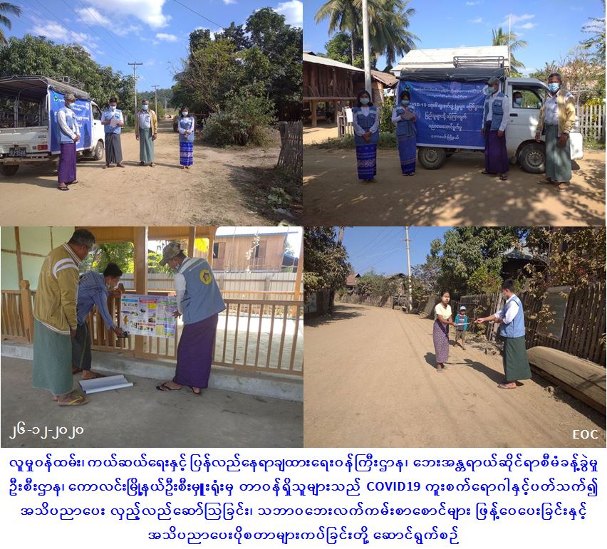 လူမှုဝန်ထမ်း၊ ကယ်ဆယ်ရေးနှင့် ပြန်လည်နေရာချထားရေးဝန်ကြီးဌာန၊ ဘေးအန္တရာယ်ဆိုင်ရာစီမံခန့်ခွဲမှုဦးစီးဌာန၊ ကောလင်းမြို့နယ်ဦးစီးမှူးရုံးမှ တာဝန်ရှိသူများသည် (၂၆-၁၂-၂၀၂၀)ရက်နေ့၊ (၀၉:၃၀)နာရီအချိန်မှစ၍ ကုက္ကိုကုန်းကျေးရွာအုပ်စုအတွင်းရှိ ကျေးရွာများအား COVID19 ကူးစက်ရောဂါနှင့်ပတ်သက်၍ အသိပညာပေး လှည့်လည်ဆော်သြခြင်း၊ သဘာဝဘေးနှင့်ပတ် သက်၍ ပြည်သူများအသိပညာဗဟုသုတရရှိစေရန်အလို့ငှာ သဘာဝဘေးလက်ကမ်းစာစောင်များ ဖြန့်ဝေပေးခြင်းနှင့် အသိပညာပေး ပိုစတာများကပ်ခြင်းတို့ ဆောင်ရွက်ခဲ့ကြောင်း သတင်းရရှိပါသည်။
