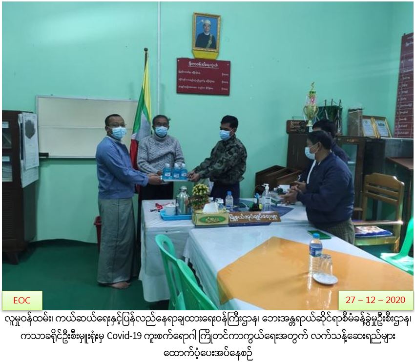 လူမှုဝန်ထမ်း၊ ကယ်ဆယ်ရေးနှင့်ပြန်လည်နေရာချထားရေးဝန်ကြီးဌာန၊ ဘေးအန္တရာယ်ဆိုင်ရာစီမံခန့်ခွဲမှုဦးစီးဌာန၊ ကသာခရိုင်ဦးစီးမှူးရုံးမှ (၂၇.၁၂.၂၀၂၀)နေ့(၁၀း၀၀)နာရီအချိန်တွင် ကသာမြို့နယ်ရှိ COVID-19 ကာကွယ်၊ ထိန်းချုပ်၊ ကုသရေးကော်မတီသို့ လက်သန့်ဆေးရည်ဘူး(၆၀)ဘူးများ ထောက်ပံ့ပေးအပ်ခဲ့ကြောင်း သတင်းရရှိပါသည်။