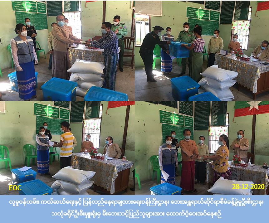 လူမှုဝန်ထမ်း၊ ကယ်ဆယ်ရေးနှင့် ပြန်လည်နေရာချထားရေးဝန်ကြီးဌာန၊ ဘေးအန္တရာယ်ဆိုင်ရာစီမံခန့်ခွဲမှုဦးစီးဌာန၊ သထုံခရိုင်ဦးစီးမှူးရုံးမှ တာဝန်ရှိသူများသည် (၂၇-၁၂-၂၀၂၀) ရက်နေ့(၁၉:၄၅)နာရီ အချိန်ခန့်တွင် မွန်ပြည်နယ်၊ သထုံခရိုင်၊ ပေါင်မြို့နယ် မုတ္တမကျေးရွာအုပ်စု၊ ပုသိမ်ကွင်းရပ် စာသင်ကျောင်းလမ်း၌ ရေနွေးအိုးတည်ထားသည့် ထင်းမီးဖို၏ မီးကြွင်းမီးကျန်မှတဆင့် မီးကူးစက်လောင်ကျွမ်းမှုကြောင့် လုံးဝပျက်စီးခဲ့သည့် လူနေအိမ်(၃)လုံးနှင့် တစိတ်တစ်ပိုင်းပျက်စီးခဲ့သည့်လူနေအိမ်(၁)လုံးတို့အတွက် အိမ်ဆောက် ပစ္စည်းဖိုးထောက်ပံ့ငွေ (၆၇၀,၀၀ဝ) ကျပ်နှင့် လူဦးရေ စုစုပေါင်း(၁၄)ဦးတို့အတွက် (၇)ရက်စာဆန် ရိက္ခာဖိုးထောက်ပံ့ငွေ (၂၉,၄၀ဝ) ကျပ်၊ စုစုပေါင်းထောက်ပံ့ငွေ (၆၉၉,၄၀ဝ) ကျပ်နှင့် လုံးဝပျက်စီးလူနေအိမ်(၃)လုံးအတွက် ကယ်ဆယ်ရေးပစ္စည်း(၁၆)မျိုးတန်ဖိုးငွေ (၁၂၇,၁၁၂) ကျပ်အားလည်းကောင်း (၂၈-၁၂-၂၀၂၀) ရက်နေ့ (၁၁:၀၀)နာရီအချိန်တွင် မုတ္တမကျေးရွာ အ.မ.က စာသင်ကျောင်း၌ မွန်ပြည်နယ်ဝန်ကြီးချုပ်၊ လုံခြုံရေးနှင့်နယ်စပ်ရေးရာဝန်ကြီး၊ လူဝင်မှုကြီးကြပ်ရေးနှင့် လူ့စွမ်းအားအရင်အမြစ်ဝန်ကြီး၊ ပေါင်မြို့နယ်အုပ်ချုပ်ရေးမှူးတို့နှင့်အတူ ဘေးသင့်ပြည်သူများထံ လက်ဝယ်အရောက် သွားရောက် ထောက်ပံ့ပေးအပ်ခဲ့ပါကြောင်း သတင်းရရှိပါသည်။