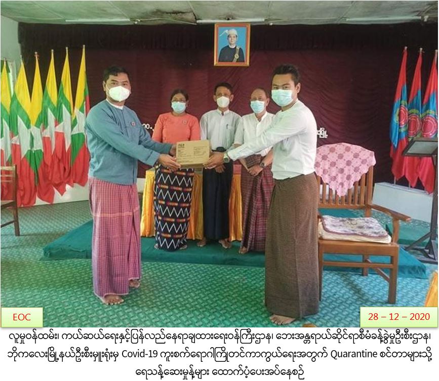 လူမှုဝန်ထမ်း၊ ကယ်ဆယ်ရေးနှင့်ပြန်လည်နေရာချထားရေးဝန်ကြီးဌာန၊ ဘေးအန္တရာယ်ဆိုင်ရာစီမံခန့်ခွဲမှုဦးစီးဌာန၊ ဘိုကလေးမြို့နယ်ဦးစီးမှူးရုံးမှ တာဝန်ရှိသူများသည် (၂၈.၁၂.၂၀၂၀) ရက်နေ့တွင် နှစ်ဆင့်အသုံးပြုရသည့် flooculent နှင့် ကလိုရင်းပါဝင်သော ရေသန့်ဆေးမှုန့် ၃ ဖာ(၇၂၀)ထုပ်အား မြို့နယ်အဆင့် covid 19 ရောဂါ ကာကွယ်၊ ထိန်းချုပ်၊ ကုသရေး ကော်မတီမှတစ်ဆင့် Quarantine စင်တာများသို့ ထောက်ပံ့ပေးအပ်ခဲ့ကြောင်း သတင်းရရှိပါသည်။