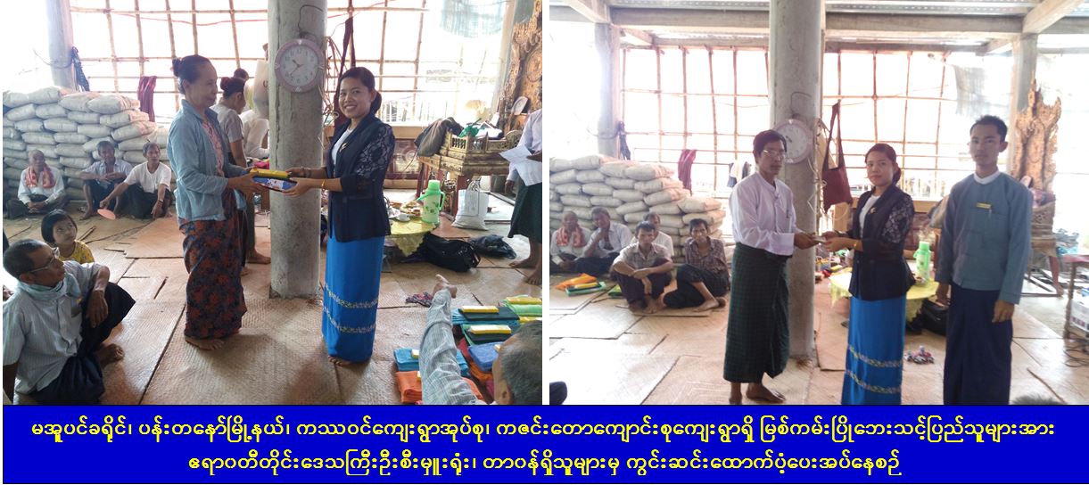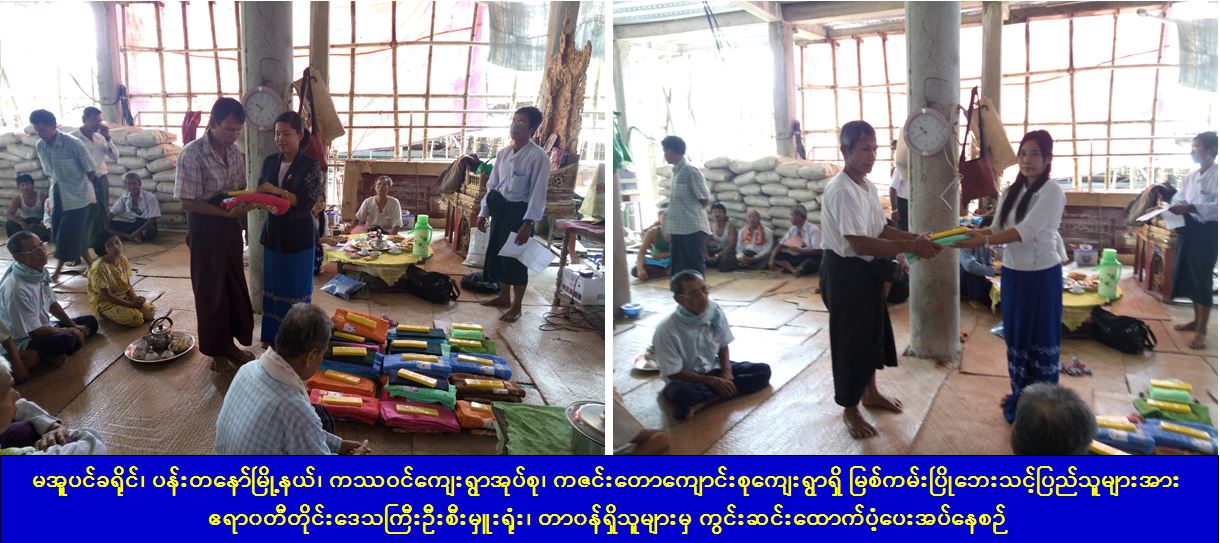 ဧရာ၀တီတိုင်းဒေသကြီး၊ မအူပင်ခရိုင်၊ ပန်းတနော်မြို့နယ်၊ ကဿဝင်ကျေးရွာအုပ်စု၊ ကဇင်းတောကျောင်းစုကျေးရွာတွင် (၂၆.၈.၂၀၁၆)ရက်နေ့၌ မြစ်ကမ်းပြိုကျမှုကြောင့် ဖျက်သိမ်းပြောင်းရွှေ့ခဲ့သည့် နေအိမ်(၂၅)လုံး၊ အိမ်ထောင်စု(၂၅)စုမှ လူဦးရေ (၁၀၈)ဦးအတွက် ကယ်ဆယ်ရေး ပစ္စည်း(၄)မျိုး၊ (၂၅)အိမ်ထောင်စုစာ၊ အိမ်ဆောက်ပစ္စည်းဖိုး (၁)အိမ်လျှင် ငွေ (၂၀,၀၀၀/-)ကျပ်နှုန်းဖြင့် (၅၀၀,၀၀၀/-)ကျပ်၊ ဆန်ရိက္ခာဖိုး(၃)ရက်စာ ငွေ(၉၇,၂၀၀/-)ကျပ်၊ စုစုပေါင်း ထောက်ပံ့ငွေ(၅၉၇,၂၀၀/-) အား (၁.၉.၂၀၁၆)ရက်နေ့တွင် ဘေးသင့်ပြည်သူများ၏လက်ဝယ်သို့ ကယ်ဆယ်ရေးနှင့် ပြန်လည်နေရာချထားရေးဦးစီးဌာန၊ ဧရာ၀တီတိုင်းဒေသကြီးဦးစီးမှူးရုံးမှ တာ၀န်ရှိသူများက ကွင်းဆင်းထောက်ပံ့ခဲ့ကြောင်း သတင်းရရှိပါသည်။