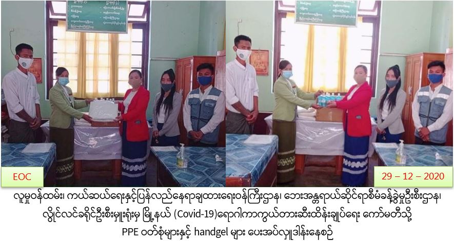 လူမှုဝန်ထမ်း၊ ကယ်ဆယ်ရေးနှင့်ပြန်လည်နေရာချထားရေးဝန်ကြီးဌာန၊ ဘေးအန္တရာယ်ဆိုင်ရာစီမံခန့်ခွဲမှုဦးစီးဌာန၊ လွိုင်လင်ခရိုင်ဦးစီးမှူးရုံးမှ တာဝန်ရှိသူများသည် (၂၉.၁၂.၂၀၂၀)ရက်နေ့တွင် လွိုင်လင်မြို့၊ မြို့နယ် အထွေထွေအုပ်ချုပ်ရေးဦးစီးဌာန၌ မြို့နယ် (Covid-19)ရောဂါ၊ကာကွယ်တားဆီးထိန်းချုပ်ရေး ကော်မတီသို့ PPEဝတ်စုံများ နှင့် (500)gပါ Handgelဘူးများ ပေးအပ်လှူဒါန်းခဲ့ကြောင်း သတင်းရရှိပါသည်။