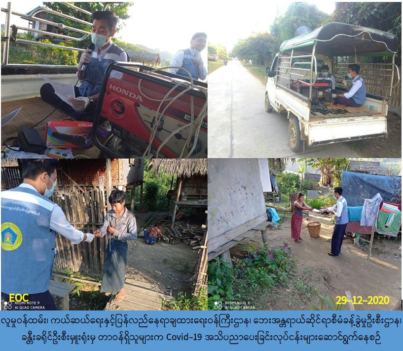 လူမှု၀န်ထမ်း၊ ကယ်ဆယ်ရေးနှင့်ပြန်လည်နေရာချထားရေး၀န်ကြီးဌာန၊ ဘေးအန္တရာယ်ဆိုင်ရာ စီမံခန့်ခွဲမှုဦးစီးဌာန၊ ခန္တီးခရိုင်ဦးစီးမှူးရုံးမှ တာ၀န်ရှိသူများသည် (၂၉-၁၂-၂၀၂၀) ရက်နေ့ (၁၅:၀၀) နာရီမှစ၍ ခန္တီးမြို့နယ်၊ အောင်သာကျေးရွာနှင့် ဖားမောင်ကျေးရွာတို့တွင် COVID-19 ကူးစက်ရောဂါအသိပညာပေးခြင်းအား အသံချဲ့စက်ဖြင့် အသိပညာပေးခြင်း ဆောင်ရွက်ခဲ့ပါ ကြောင်းသတင်းရရှိပါသည်။