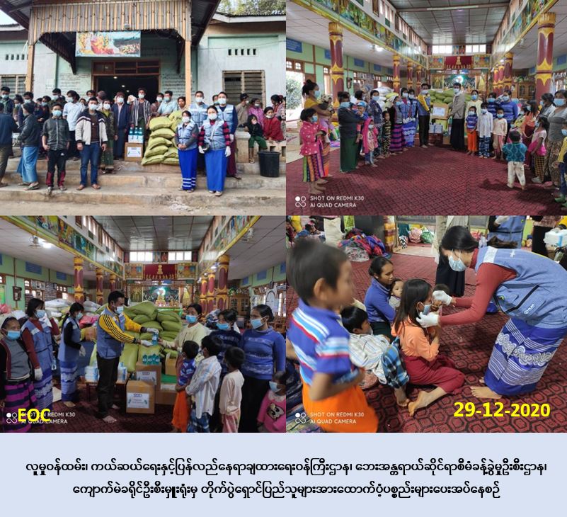 လူမှုဝန်ထမ်း၊ ကယ်ဆယ်ရေးနှင့် ပြန်လည်နေရာချထားရေးဝန်ကြီးဌာန၊ ဘေးအန္တရာယ်ဆိုင်ရာ စီမံခန့်ခွဲမှုဦးစီးဌာန၊ ကျောက်မဲခရိုင်ဦးစီးမှူးရုံးမှ တာဝန်ရှိသူများသည် (၂၅-၁၂-၂၀၂၀) ရက်နေ့တွင် ကျောက်မဲမြို့နယ်၊ လွယ်အံ(တင်း)ကျေးရွာအုပ်စု၊ ပိန္နဲကုန်းကျေးရွာရှိ ဝါဆိုဘုန်း တော်ကြီးကျောင်း၊ အ.မ.က (မန်ကောင်းမှု) နှင့် သန္တိသုခ (၈) ကွက်ဓမ္မာရုံသို့ တိမ်းရှောင် ရောက်ရှိလာသည့် တိုက်ပွဲရှောင် အိမ်ထောင်စု (၁၄၈) စု၊ လူဦးရေ (၆၀၅) ဦးတို့အတွက် ဆန်ရိက္ခာ(၇) ရက်စာ တန်ဖိုးငွေ (၁,၂၇၀,၅၀ဝ/-) ကျပ်ရှိ ဆန် (၄၄) အိတ်၊ (၅) ပြည်၊ Mask ( ၅၀) ပါ (၂၄) ဘူးနှင့် Hand Sanitizer (၁၄၈) ဘူး တို့အား (၂၉-၁၂-၂၀၂၀) ရက်နေ့ (၁၅:၃ဝ) နာရီအချိန်တွင် ဝါဆိုဘုန်းတော်ကြီးကျောင်း၌ ပြည်သူများလက်ဝယ်အရောက် ထောက်ပံ့ပေး အပ်ခဲ့ကြောင်း သတင်းရရှိပါသည်။