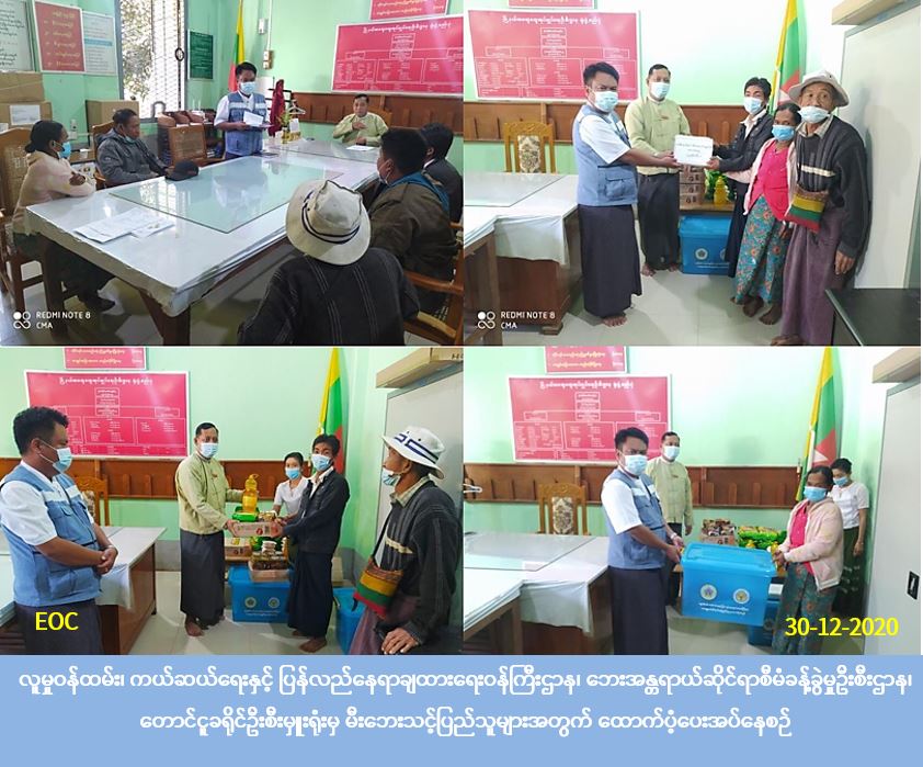 လူမှုဝန်ထမ်း၊ ကယ်ဆယ်ရေးနှင့် ပြန်လည်နေရာချထားရေးဝန်ကြီးဌာန၊ ဘေးအန္တရာယ်ဆိုင်ရာစီမံခန့်ခွဲမှုဦးစီးဌာန၊ ပဲခူးတိုင်းဒေသကြီး၊ တောင်ငူခရိုင်ဦးစီးမှူးရုံးမှ တာဝန်ရှိသူများသည် ရေတာရှည်မြို့နယ်၊ သစ်ပုပ္ပင် ကျေးရွာအုပ်စု၊ မန်ကျည်းကုန်းကျေးရွာတွင် (၂၈-၁၂-၂၀၂၀) ရက်နေ့၌ ဖြစ်ပွားခဲ့သော မီးဘေးကြောင့် ပျက်စီးဆုံးရှုံးခဲ့သည့် နေအိမ် (၂)လုံးနှင့် တစ်စိတ်တစ်ပိုင်းပျက်စီးခဲ့သည့်နေအိမ် (၁) လုံးအတွက် အိမ်ဆောက်ပစ္စည်းဖိုး (၂၄၀,၀၀၀)ကျပ်၊ ဘေးသင့်လူဦးရေ (၁၆) ဦးအတွက် ဆန်ဖိုးထောက်ပံ့ငွေ (၃၃,၆၀၀) ကျပ်၊ စုစုပေါင်းထောက်ပံ့ငွေ (၂၇၃,၆၀၀) ကျပ်အား (၃၀-၁၂-၂၀၂၀) ရက်နေ့ (၁၀:၃၀) အချိန်တွင် မြို့နယ်အထွေထွေအုပ်ချုပ်ရေးဦးစီးဌာနမှ တာဝန်ရှိသူများနှင့်အတူ ထောက်ပံ့ပြီးဖြစ်ပါကြောင်း သတင်းရရှိပါသည်။