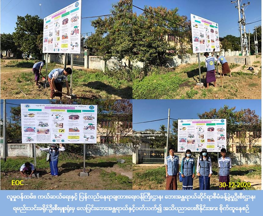 လူမှုဝန်ထမ်း၊ ကယ်ဆယ်ရေးနှင့် ပြန်လည်နေရာချထားရေးဝန်ကြီးဌာန၊ ဘေးအန္တရာယ်ဆိုင်ရာစီမံခန့်ခွဲမှုဦးစီးဌာန၊ ရမည်းသင်းခရိုင်ဦးစီးမှူးရုံးမှ တာဝန်ရှိသူများသည် (၃၀-၁၂-၂၀၂၀) ရက်နေ့ (၁၂:၀၀) နာရီအချိန်တွင် ရမည်းသင်းမြို့၊ အမှတ်(၅)၊ အခြေခံပညာအထက်တန်းကျောင်း(မြို့မ)ကျောင်းဝင်းအပြင်ဘက်၌(၉ပေx၆ပေ)အရွယ်အစားရှိမြေစိုက်ဆိုင်းဘုတ်အားလေပြင်းဘေးအန္တရာယ်နှင့်ပတ်သက်၍ ဆောင်ရန်/ ရှောင်ရန် အချက်အလက်များပါသည့် ဗီနိုင်းပိုစတာကပ်၍ အများပြည်သူများ အလွယ်တကူဖတ်ရှုနိုင်ရန် စိုက်ထူပေးခဲ့ပါပြောင်း သတင်းရရှိပါသည်။