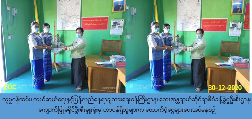လူမှုဝန်ထမ်း၊ ကယ်ဆယ်ရေးနှင့်ပြန်လည်နေရာချထားရေးဝန်ကြီးဌာန၊ ဘေးအန္တရာယ်ဆိုင်ရာ စီမံခန့်ခွဲမှုဦးစီးဌာန၊ ကျောက်ဖြူခရိုင်ဦးစီးမှူးရုံးမှ တာဝန်ရှိသူများသည် အမ်းမြို့နယ်အတွင်း တိုက်ပွဲရှောင်စုရပ် (၁၁) ခုတွင် ရောက်ရှိနေသော တိုက်ပွဲရှောင် အိမ်ထောင်စု (၈၅၆) စု၊ လူဦးရေ (၃,၈၀၄) ဦးတို့အတွက် ဆန်ရိက္ခာ (၁) လစာဖိုး ထောက်ပံ့ငွေ (၃၄,၂၃၆,၀၀ဝ/-) အား အမ်းမြို့ နယ်အထွေထွေအုပ်ချုပ်ရေးဦးစီးဌာန၊ ခေတ္တမြို့နယ်အုပ်ချုပ်ရေးမှူးထံသို့ (၃၀-၁၂-၂၀၂၀) ရက် နေ့ (၁၅:၃၀) နာရီအချိန်တွင် လွှဲပြောင်းထောက်ပံ့ခဲ့ပါကြောင်း သတင်းရရှိပါသည်။