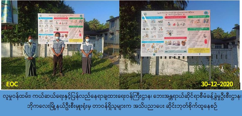 လူမှုဝန်ထမ်း၊ ကယ်ဆယ်ရေးနှင့် ပြန်လည်နေရာချထားရေးဝန်ကြီးဌာန၊ ဘေးအန္တရာယ်ဆိုင်ရာ စီမံခန့်ခွဲမှုဦးစီးဌာန၊ ဘိုကလေးမြို့နယ်ဦးစီးမှူးရုံးမှ တာဝန်ရှိသူများသည် (၃၀-၁၂-၂၀၂၀) ရက်နေ့ (၁၁:၀၀) နာရီအချိန်တွင် ဘိုကလေးမြို့၊ အမှတ် (၄) ရပ်ကွက်၊ (၁၈) လမ်းထိပ်၌ မီးဘေး အန္တရာယ်နှင့် ပတ်သက်၍ ပြည်သူများအသိပညာများရရှိစေရန် ရည်ရွယ်၍ မီးဘေးအန္တရာယ် ဆိုင်ရာ ပညာပေး (၉’x၆’) ဗီနိုင်းပိုစတာဆိုင်းဘုတ်အား စိုက်ထူပေးခဲ့ပါကြောင်း သတင်းရရှိ ပါသည်။