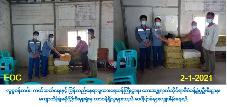 လူမှုဝန်ထမ်း၊ ကယ်ဆယ်ရေးနှင့် ပြန်လည်နေရာချထားရေးဝန်ကြီးဌာန၊ ဘေးအန္တရာယ် ဆိုင်ရာစီမံခန့်ခွဲမှုဦးစီးဌာန၊ ကျောက်ဖြူခရိုင်ဦးစီးမှူးရုံးမှ တာဝန်ရှိသူများသည် (၂-၁-၂၀၂၁) ရက်နေ့၊ (၁၂:၃၀) အချိန်တွင် ကျောက်ဖြူမြို့နယ်၊ ဂုံးချွိန်ကျေးရွာအုပ်စု၊ ကျောက်တစ်လုံး IDP စခန်းတွင် COVID-19 ရောဂါကြိုတင်ကာကွယ်ရေးပစ္စည်းများဖြစ်သည့် ဆပ်ပြာ(၃)လစာ (သြဂုတ်၊စက်တင်ဘာ၊အောက်တိုဘာ) (၃၀၃၀) တောင့်အား စခန်းစီမံခန့်ခွဲမှုကော်မတီဝင် များထံသို့ သွားရောက်ထောက်ပံ့ပေးအပ်ခဲ့ကြောင်း သတင်းရရှိပါသည်။