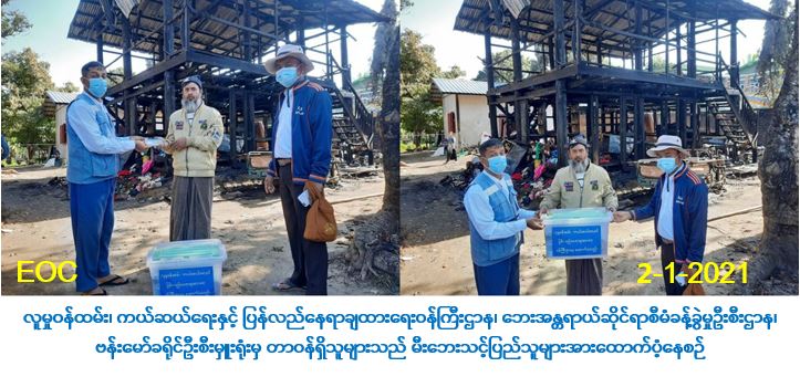 လူမှုဝန်ထမ်း၊ ကယ်ဆယ်ရေးနှင့် ပြန်လည်နေရာချထားရေးဝန်ကြီးဌာန၊ ဘေးအန္တရာယ် ဆိုင်ရာစီမံခန့်ခွဲမှုဦးစီးဌာန၊ ဗန်းမော်ခရိုင်ဦးစီးမှူးရုံးမှ တာဝန်ရှိသူများသည် ဗန်းမော်မြို့နယ်၊ သာစည်ရပ်ကွက်တွင် (၁-၂-၂၀၂၁) ရက်နေ့၌ ဖြစ်ပွားသော မီးဘေးသင့်အိမ်ထောင်စု(၁)စု၊ လူဦးရေ(၁၃)ဦးတို့အတွက် အိမ်ဆောက်တန်ဖိုးငွေ(၂၀၀,၀၀ဝိ/-) ကျပ်၊ ဆန်ရိက္ခာဖိုးငွေ (၂၇,၃၀ဝိ/-) ကျပ်နှင့် ကယ်ဆယ်ရေးပစ္စည်း(၁၈)မျိူးတို့အား (၂-၁-၂၀၂၁)ရက်နေ့၊ နံနက် (၁၁:၃၀) နာရီအချိန်၌ ဘေးသင့်ပြည်သူများထံသို့ လက်ဝယ်အရောက် ထောက်ပံ့ခဲ့ကြောင်း သတင်းရရှိပါသည်။