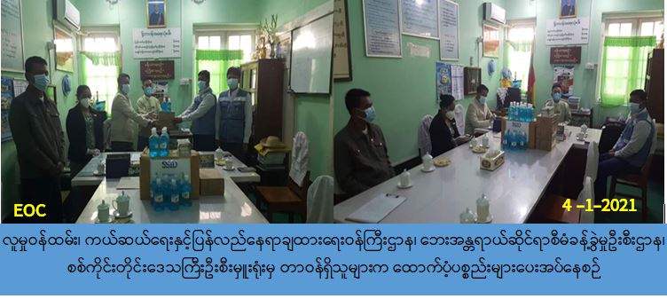 လူမှုဝန်ထမ်း၊ ကယ်ဆယ်ရေးနှင့် ပြန်လည်နေရာချထားရေးဝန်ကြီးဌာန၊ ဘေးအန္တရာယ်ဆိုင်ရာ စီမံခန့်ခွဲမှုဦးစီးဌာန၊ စစ်ကိုင်းတိုင်းဒေသကြီးဦးစီးမှူးရုံးမှ တာဝန်ရှိသူများသည် (၄-၁-၂၀၂၁) ရက်နေ့ (၁၀:၀၀) နာရီအချိန်တွင်မြင်းမူမြို့နယ်၊ အထွေထွေအုပ်ချုပ်ရေးဦးစီးဌာန၊ အစည်းအ ဝေးခန်းမ၌ မြို့နယ် (COVID-19) ထိန်းချုပ်ရေးနှင့် အရေးပေါ်တုံ့ပြန်ရေးကော်မတီသို့ ရေသန့် ဆေးရည် (၂၄၀) ထုပ်ပါ (၃) ဖာ၊ လက်သန့်ဆေးရည် (၅၀) ဘူးထောက်ပံ့လှူဒါန်းခြင်းနှင့် မြို့နယ်အတွက်မီးဘေး၊ ငလျင်ဘေး သဘာဝဘေးလက်ကမ်းစာစောင်များ ပေးအပ်မှုတွင် လွှတ်တော်ကိုယ်စားလှယ်များမှ လက်ခံရယူခဲ့ပါကြောင်း သတင်းရရှိပါသည်။