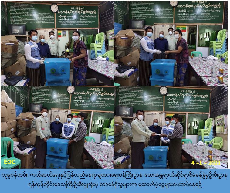 လူမှုဝန်ထမ်း၊ ကယ်ဆယ်ရေးနှင့် ပြန်လည်နေရာချထားရေးဝန်ကြီးဌာန၊ ဘေးအန္တရာယ်ဆိုင်ရာ စီမံခန့်ခွဲမှုဦးစီးဌာန၊ ရန်ကုန်တိုင်းဒေသကြီးဦးစီးမှူးရုံးမှ တာဝန်ရှိသူများသည် အင်းစိန်မြို့နယ်၊ ဖော့ကန်ရပ်ကွက်၊ အောင်မင်္ဂလာ(၂) လမ်းတွင် (၄-၁-၂၀၂၁) ရက်နေ့ (၀၃:၃၀) နာရီအချိန်၌ မီးလောင်မှုဖြစ်ပွားခဲ့ရာ နေအိမ် (၂) လုံးမီးလောင်ပျက်စီးခဲ့ပြီး၊ အိမ်ထောင်စု (၂) စုမှ လူဦးရေ (၁၁) ဦးတို့မီးဘေးသင့်ခဲ့ပါသဖြင့် နေအိမ် (၂) လုံးအတွက် အိမ်ဆောက်ပစ္စည်းဖိုးထောက်ပံ့ငွေ (၄၀၀,၀၀၀/-) ကျပ် ၊ လူဦးရေ (၁၁) ဦးအတွက် ဆန်ရိက္ခာဖိုးထောက်ပံ့ငွေ (၂၃,၁၀၀/-) ကျပ်နှင့် ကယ်ဆယ်ရေးပစ္စည်း (၁၆) မျိုး (၂) အိမ်ထောင်စုစာတို့အား အထွေထွေအုပ်ချုပ်ရေးဦးစီးဌာနမှ တာဝန်ရှိသူများနှင့်အတူ ဘေးသင့်ပြည်သူများထံသို့ (၄-၁-၂၀၂၁) ရက်နေ့ (၁၄:၀၀) နာရီအချိန် ၌ သွားရောက်ထောက်ပံ့ပေးအပ်ခဲ့ပါကြောင်း သတင်းရရှိပါသည်။