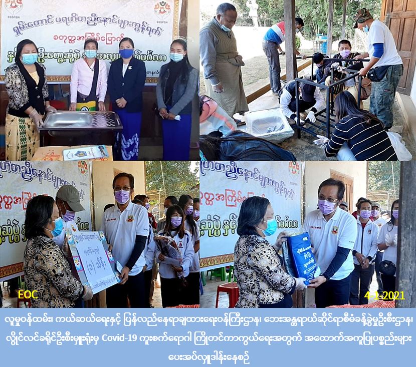 လူမှုဝန်ထမ်း၊ ကယ်ဆယ်ရေးနှင့် ပြန်လည်နေရာချထားရေးဝန်ကြီးဌာန၊ ဘေးအန္တရာယ်ဆိုင်ရာ စီမံခန့်ခွဲမှုဦးစီးဌာန၊ လွိုင်လင်ခရိုင်ဦးစီးမှူးရုံးမှ တာဝန်ရှိသူများသည် (၄-၁-၂၀၂၁) ရက်နေ့တွင် KBZ(Covid-19) စားနပ်ရိက္ခာထောက်ပံ့ရေးကော်မတီ၊ ရှမ်းတောင်ပရဟိတကွန်ရက်၊ လူမှုကူညီရေးအသင်းအဖွဲ့များနှင့်အတူ နမ်ဆန်မြို့နယ်၊ ခိုလမ်မြို့၊ ဝမ်စိမ်းကျေးရွာ၊ ဝမ်စိမ်းဘဝသစ်အားမာန်(မျက်မမြင်ကျောင်း)သို့ ရောက်ရှိပြီး ဦးစီးဌာနမှ စတီးလက်ဆေးဘေစင်(၃)လုံး၊ Mask(ပိတ်စ)(၁၀၀)ခု၊ (500g)ပါလက်သန့်ဆေးရည်များ၊ (၃၀၀၀)g ပါ Sue Sat ဆပ်ပြာမှုန့်ထုပ်များ၊ ကြွေဆေးရည်ဘူးများ၊ (Dettol) ပိုးသတ်ဆေးရည်ဘူးကြီးများ၊ တစ်ခါသုံးလက်အိတ်များ၊ အပူချိန်တိုင်းကိရိယာအားလည်းကောင်း၊ KBZ(စားနပ်ရိက္ခာထောက်ပံ့ရေးကော်မတီ၊ ရှမ်းတောင်ပရဟိတကွန်ရက်နှင့် လူမှုကူညီရေးအသင်းအဖွဲ့မှ စားသောက်ကုန်များ၊ မီးဖိုချောင်သုံးလျှပ်စစ်ပစ္စည်းများ၊ လူသုံးကုန်ပစ္စည်းများအဝတ် အထည်များနှင့် အလှူငွေများအားလည်းကောင်း၊ ကျောင်းအုပ်ဆရာမကြီးထံသို့ အသီးသီးပေးအပ်လှူဒါန်းခဲ့ပါကြောင်း သတင်းရရှိပါသည်။