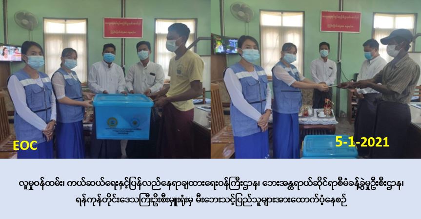 လူမှုဝန်ထမ်း၊ ကယ်ဆယ်ရေးနှင့် ပြန်လည်နေရာချထားရေးဝန်ကြီးဌာန၊ ဘေးအန္တရာယ်ဆိုင်ရာ စီမံခန့်ခွဲမှုဦးစီးဌာန၊ ရန်ကုန်တိုင်းဒေသကြီးဦးစီးမှူးရုံးမှ တာဝန်ရှိသူများသည် ရန်ကုန်တိုင်း ဒေသကြီး၊ လှိုင်သာယာ(အနောက်ပိုင်း)မြို့နယ်၊ ကုလားကြီးစုကျေးရွာအုပ်စု၊ ကျောင်းလမ်း သွယ်(၂)လမ်းတွင် (၃-၁-၂၀၂၁)ရက်နေ့ (၀၇း၅၇)နာရီအချိန်၌ မီးလောင်မှုဖြစ်ပွားခဲ့ရာ နေအိမ်(၁)လုံးမီးလောင်ဆုံးရှုံးခဲ့ပြီး၊ အိမ်ထောင်စု (၂)စုမှ လူဦးရေ (၈)ဦးတို့မီးဘေးသင့်ခဲ့ပါသဖြင့် မီးဘေးသင့် နေအိမ် (၁)လုံးအတွက် အိမ်ဆောက်ပစ္စည်းဖိုးထောက်ပံ့ငွေ (၂၀၀,၀၀၀/-)ကျပ်၊ လူဦးရေ (၈)ဦးအတွက် ဆန်ရိက္ခာဖိုးထောက်ပံ့ငွေ (၁၆,၈၀၀/-)ကျပ် နှင့် ကယ်ဆယ်ရေးပစ္စည်း (၁၆)မျိုး (၂)အိမ်ထောင်စုစာတို့အား အထွေထွေအုပ်ချုပ်ရေးဦးစီးဌာနမှ တာဝန်ရှိသူများနှင့်အတူ ဘေးသင့်ပြည်သူများထံသို့ (၅-၁-၂၀၂၁)ရက်နေ့ (၁၂း၀၀)နာရီအချိန်၌ သွားရောက်ထောက်ပံ့ခဲ့ ကြောင်း သတင်းရရှိပါသည်။