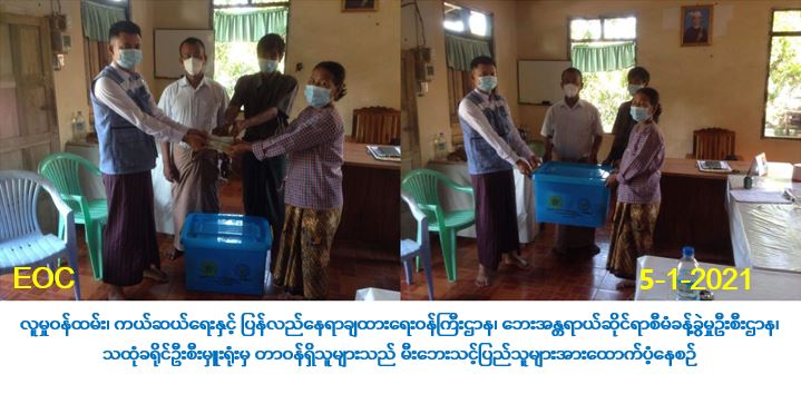 လူမှုဝန်ထမ်း၊ ကယ်ဆယ်ရေးနှင့် ပြန်လည်နေရာချထားရေးဝန်ကြီးဌာန၊ ဘေးအန္တရာယ် ဆိုင်ရာစီမံခန့်ခွဲမှုဦးစီးဌာန၊ သထုံခရိုင်ဦးစီးမှူးရုံးမှ တာဝန်ရှိသူများသည် (၂-၁-၂၀၂၁) ရက်နေ့၊ (၂၀:၃၀) နာရီအချိန်ခန့်တွင် မွန်ပြည်နယ်၊ သထုံခရိုင်၊ ပေါင်မြို့နယ် ကျခတ်ငူ ကျေးရွာအုပ်စု ရာဘာခြံလမ်း၌ မီးလောင်ကျွမ်းမှုကြောင့် လုံးဝပျက်စီးခဲ့သည့်လူနေအိမ်(၁)လုံးအတွက် အိမ်ဆောက်ပစ္စည်းဖိုး ထောက်ပံ့ငွေ (၂၀၀,၀၀ဝ/-) ကျပ်နှင့်လူဦးရေ စုစုပေါင်း(၄)ဦးအတွက် (၇)ရက်စာ ဆန်ရိက္ခာ ဖိုးထောက်ပံ့ငွေ (၈,၄၀ဝ/-) ကျပ်၊ စုစုပေါင်းထောက်ပံ့ငွေ (၂၀၈,၄၀ဝ/-) ကျပ်အား လည်းကောင်းလုံးဝပျက်စီးလူနေအိမ်(၁)လုံးအတွက် ကယ်ဆယ်ရေးပစ္စည်း(၁၆)မျိုး တန်ဖိုး ငွေ (၄၆,၀၃၆/-) ကျပ်အားလည်းကောင်း (၅-၁-၂၀၂၁)ရက်နေ့၊ (၁၅:၀၀)နာရီအချိန်ခန့်တွင် ကျခတ်ငူကျေးရွာအုပ်ချုပ်ရေးမှူးရုံး၌ ဘေးသင့်ပြည်သူများထံ လက်ဝယ်အရောက် သွားရောက်ထောက်ပံ့ပေးအပ်ခဲ့ကြောင်း သတင်းရရှိပါသည်။