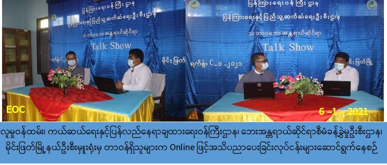 လူမှုဝန်ထမ်း၊ ကယ်ဆယ်ရေးနှင့် ပြန်လည်နေရာချထားရေးဝန်ကြီးဌာန၊ ဘေးအန္တရာယ်ဆိုင်ရာ စီမံခန့်ခွဲမှုဦးစီးဌာန၊ မိုင်းဖြတ်မြို့နယ်ဦးစီးမှူးရုံးမှ တာဝန်ရှိသူများသည် (၆-၁-၂၀၂၁) ရက်နေ့ တွင် ပြန်ကြားရေးနှင့် ပြည်သူ့ဆက်ဆံရေးဦးစီးဌာန၊ မိုင်းဖြတ်မြို့နယ်ဦးစီးမှူးရုံးတွင် ကျင်းပ ပြုလုပ်သည့် Online Talk Show အစီအစဉ်၌ ဦးစီးဌာန၏ ရည်ရွယ်ချက်နှင့် လုပ်ငန်း တာဝန်များ၊ သဘာဝဘေးအန္တရာယ်ဆိုင်ရာ အသိပညာပေးခြင်းများကို Covid-19 ကာလ အတွင်း online မှ တဆင့်အသိပညာပေးလုပ်ငန်းများ ဆောင်ရွက်ခဲ့ပါကြောင်း သတင်းရရှိပါ သည်။