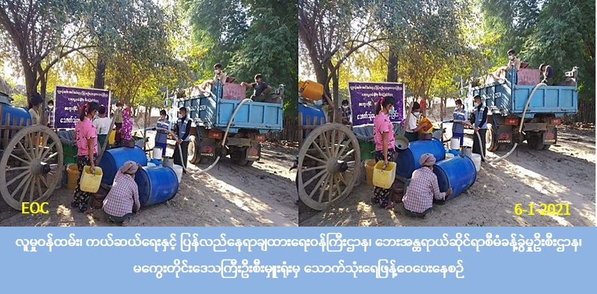 လူမှုဝန်ထမ်း၊ ကယ်ဆယ်ရေးနှင့် ပြန်လည်နေရာချထားရေးဝန်ကြီးဌာန၊ ဘေးအန္တရာယ်ဆိုင်ရာစီမံခန့်ခွဲမှုဦးစီးဌာန၊ မကွေးတိုင်းဒေသကြီးဦးစီးမှူးရုံးမှ တာဝန်ရှိသူများသည် သောက်သုံးရေခက်ခဲသော မကွေးမြို့နယ်၊ ကြာကန်ကျေးရွာအုပ်စု၊ ကြာကန်ကျေးရွာ၊ ချောင်းဆင်း(တဲတိုက်)ရှိ အိမ်ခြေ (၁၀၁) လုံး၊ အိမ်ထောင်စု(၁၀၇) စု၊ လူဦးရေ (၅၀၃) ဦးတို့အတွက် သောက်သုံးရေဂါလံ (၆,၀၀၀) အား ( ၆- ၁-၂၀၂၁) ရက်နေ့ ( ၁၁ : ၃၀ ) နာရီအချိန်တွင် သွားရောက်ဖြန့်ဝေပေးခဲ့ပါကြောင်း သတင်းရရှိပါသည်။