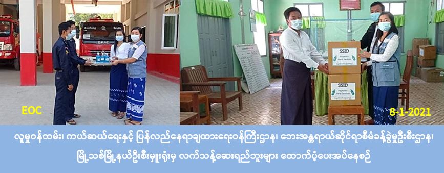 လူမှုဝန်ထမ်း၊ ကယ်ဆယ်ရေးနှင့်ပြန်လည် နေရာချထားရေးဝန်ကြီးဌာန၊ ဘေးအန္တရာယ်ဆိုင်ရာ စီမံခန့်ခွဲမှုဦးစီးဌာန၊ မြို့သစ်မြို့နယ်ဦးစီးမှူးရုံးမှ တာဝန်ရှိသူများသည် (၈-၁-၂၀၂၁) ရက်နေတွင် မြို့သစ်မြို့နယ်(Covid-19) ထိန်းချုပ်ရေးနှင့် အရေးပေါ်တုံ့ပြန်ရေးကော်မတီသို့ Hand Sanitizer(500ml)ပါ (၅၀)ဘူး၊ မြို့သစ်မြို့နယ် မီးသတ်ဦးစီးဌာနသို့ Hand Sanitizer (500ml)ပါ(၂၅)ဘူးတို့အား သွားရောက်လှူဒါန်းခဲ့ပါကြောင်း သတင်းရရှိပါသည်။