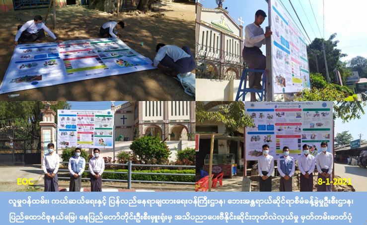 လူမှုဝန်ထမ်း၊ ကယ်ဆယ်ရေးနှင့် ပြန်လည်နေရာချထားရေးဝန်ကြီးဌာန၊ ဘေးအန္တရာယ်ဆိုင်ရာစီမံခန့်ခွဲမှုဦးစီးဌာန၊ ပြည်ထောင်စုနယ်မြေ၊ နေပြည်တော်တိုင်းဦးစီးမှူးရုံးမှ တာဝန်ရှိသူများသည် နေပြည်တော်ကောင်စီနယ်မြေအတွင်း ရာသီအလိုက်ဖြစ်ပွားတတ်သော ဘေးအန္တရာယ်များနှင့်ပတ်သက်၍ ဆောင်ရန်၊ ရှောင်ရန် အချက်များကို ပြည်သူများသိရှိစေရန်အတွက် အသိပညာပေး ဗီနိုင်းဆိုင်းဘုတ်ပိုစတာကို ဇမ္ဗူသီရိမြို့နယ်၊ ပြန်ကပြေးဈေး၊ ရွှေကြာပင်ဈေး၊ လယ်ဝေးမြို့နယ်၊ မြို့မဈေးအနီးနှင့် ပျဉ်းမနားမြို့နယ်၊ ရွှေညောင်ပင်ကားဂိတ်အနီးတို့တွင် (၈-၁-၂၀၂၁) ရက်နေ့တွင် ဆိုင်းဘုတ်လဲလှယ်တပ်ဆင်ပေးခဲ့ပါသည်။