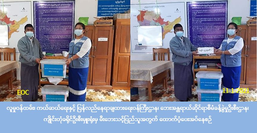 လူမှုူဝန်ထမ်း၊ ကယ်ဆယ်ရေးနှင့် ပြန်လည်နေရာချထားရေးဝန်ကြီးဌာန၊ ဘေးအန္တရာယ်ဆိုင်ရာစီမံခန့်ခွဲမှုဦးစီးဌာန၊ ကျိုင်းတုံခရိုင်ဦးစီးမှူးရုံးရှိ တာဝန်ရှိသူများသည် (၉-၁-၂၀၂၁) ရက်နေ့၊ (၁၇:၃၀) အချိန်ခန့်တွင် ကျိုင်းတုံခရိုင်၊ မိုင်းယန်းမြို့နယ်၊ ယန်းကောင်ကျေးရွာအုပ်စု၊ နမ့်ခေးကောင်ကျေးရွာတွင် ဖြစ်ပွားခဲ့သည့် မီးဘေးသင့်အိမ်ခြေ (၂)လုံးအတွက် အိမ်ဆောက်ပစ္စည်းတန်ဖိုးငွေ (၄၀၀,၀၀၀) ကျပ် ၊ လူဦးရေ (၁၃)ဦးအတွက် ဆန်ရိက္ခာ (၇)ရက်စာ တန်ဖိုးငွေ (၂၇,၃၀၀) ကျပ်နှင့် အိမ်ထောင်စု (၂) စုအတွက် ကယ်ဆယ်ရေးပစ္စည်း (၂၂) မျိုးတို့အား (၁၁-၁-၂၀၂၁) ရက်နေ့၊ (၁၄:၃၀) အချိန်ခန့်တွင် ထောက်ပံ့ခဲ့ပါကြောင်း သတင်းရရှိပါသည်။