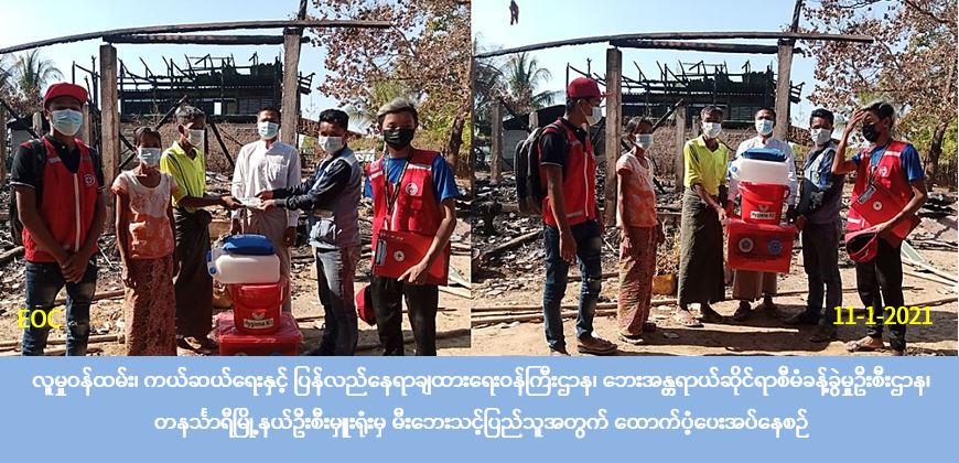 လူမှုူဝန်ထမ်း၊ ကယ်ဆယ်ရေးနှင့် ပြန်လည်နေရာချထားရေးဝန်ကြီးဌာန၊ ဘေးအန္တရာယ်ဆိုင်ရာစီမံခန့်ခွဲမှုဦးစီးဌာန၊ တနင်္သာရီမြို့နယ်ဦးစီးမှူးရုံးမှ တာဝန်ရှိသူများသည် တနင်္သာရီမြို့နယ်၊ သကျက်ကျေးရွာအုပ်စု၊ ဆင်ခေါင်းကျေးရွာတွင် (၈-၁-၂၀၂၁) ရက်နေ့၌ ဖြစ်ပွားခဲ့သော မီးဘေးကြောင့် ပြိုကျပျက်စီးသွားသည့်အိမ်ခြေ (၂) လုံးအတွက် အိမ်ဆောက်ပစ္စည်းဖိုးငွေ (၄၀၀,၀၀၀)ကျပ်၊ လူဦးရေ (၁၁) ဦးအတွက်ဆန်ဖိုး (၇) ရက်စာ (၂၃,၁၀၀) ကျပ်၊ စုစုပေါင်းထောက်ပံငွေ (၄၂၃,၁၀၀) ကျပ်နှင့် ကယ်ဆယ်ရေးပစ္စည်း (၁၇) မျိုးပါ (၁) ပုံးကို မြို့နယ်ကြက်ခြေနီ၊ ရပ်ကျေးအုပ်ချုပ်ရေးမှူးများနှင့်အတူ (၁၁-၁-၂၀၂၁) ရက်နေ့ (၁၄:၂၀) အချိန်တွင် ထောက်ပံပေးအပ်ခဲ့ပါကြောင်း သတင်းရရှိပါသည်။