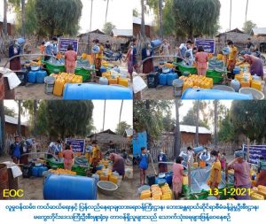 လူမှုဝန်ထမ်း၊ ကယ်ဆယ်ရေးနှင့် ပြန်လည်နေရာချထားရေးဝန်ကြီးဌာန၊ ဘေးအန္တရာယ် ဆိုင်ရာစီမံခန့်ခွဲမှုဦးစီးဌာန၊ မကွေးတိုင်းဒေသကြီးဦးစီးမှူးရုံးမှ တာဝန်ရှိသူများသည် ( ၁၃- ၁-၂၀၂၁) ရက်နေ့၊ (၁၁:၀၀) နာရီအချိန်တွင် သောက်သုံးရေခက်ခဲသော မကွေးမြို့နယ်၊ ကြာကန်ကျေးရွာအုပ်စု၊ ဦးဝင်းကြည်(တဲတိုက်)ရှိ အိမ်ခြေ (၁၀၇) လုံး၊ အိမ်ထောင်စု(၁၂၁) စု၊ လူဦးရေ (၅၃၉) ဦးတို့အတွက် သောက်သုံးရေဂါလံ (၆၀၀၀) အား သွားရောက်ဖြန့်ဝေပေးခဲ့ကြောင်း သတင်းရရှိပါသည်။