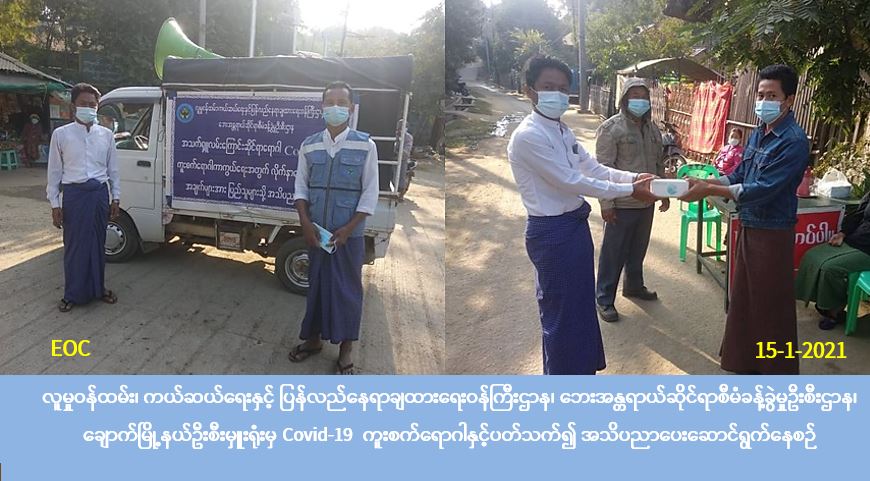 လူမှုဝန်ထမ်း၊ ကယ်ဆယ်ရေးနှင့် ပြန်လည်နေရာချထားရေးဝန်ကြီးဌာန၊ ဘေးအန္တရာယ်ဆိုင်ရာစီမံခန့်ခွဲမှုဦးစီးဌာန၊ ချောက်မြို့နယ်ဦးစီးမှူးရုံးမှ တာဝန်ရှိသူများသည် (၁၅-၁-၂၀၂၁) ရက်နေ့တွင် ချောက်မြို့အတွင်းရှိ အမှတ်(၁၊ ၂၊ ၃၊ ၄၊ ၅) ရပ်ကွက်တို့တွင် COVID-19 ရောဂါနှင့်ပတ်သက်၍ အသိပညာပေးခြင်း၊ Mask များ ပေးခြင်းတို့ကိုဆောင်ရွက်ခဲ့ပါကြောင်း သတင်ရရှိပါသည်။