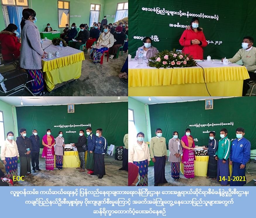 လူမှုဝန်ထမ်း၊ ကယ်ဆယ်ရေးနှင့် ပြန်လည်နေရာချထားရေးဝန်ကြီးဌာန၊ ဘေးအန္တရာယ်ဆိုင်ရာစီမံခန့်ခွဲမှုဦးစီးဌာန၊ ကချင်ပြည်နယ်ဦးစီးမှူးရုံးမှ တာဝန်ရှိသူများသည် ပြည်နယ်လွှတ်တော်ကိုယ်စားလှယ်နှင့်အတူ (၁၄-၁-၂၀၂၁) ရက်နေ့ (၁၀:၀၀) နာရီအချိန်တွင် ကချင်ပြည်နယ်၊ ဆော့လော်မြို့နယ်ရှိ ပြောင်းခင်းများ ပိုးကျပျက်စီးမှုကြောင့် အခက်အခဲကြုံတွေ့နေရသော ဒေသခံပြည်သူများအား ဆန်ရိက္ခာထောက်ပံရန် မြို့နယ်အစည်းအဝေးခန်းမ၌ အခမ်းအနားကျင်းပပြုလုပ်ခဲ့ရာ ပြည်နယ်လွှတ်တော်ကိုယ်စားလှယ်က အဖွင့်အမှာစကား ပြောကြားပြီး ညွှန်ကြားရေးမှူးမှ ထောက်ပံ့မှုနှင့်စပ်လျဉ်း၍ ရှင်းလင်းပြောကြားခဲ့ပါသည်။ ၎င်းနောက် ကျေးရွားအုပ်စု(၁၇)စုမှ အိမ်ထောင်စု(၉၅၉)စု၊ လူဦးရေ (၆,၇၈၉) ဦးတို့အတွက် ဆန်ရိက္ခာ(၂)လစာ (၄,၂၄၃) အိတ်၊ (၃)ပြည်အား သက်ဆိုင်ရာမြို့နယ်နှင့် ကျေးရွာအုပ်ချုပ်ရေးတာဝန်ရှိသူများထံသို့ ထောက်ပံ့ပေးအပ်ခဲ့ပါကြောင်း သတင်းရရှိပါသည်။