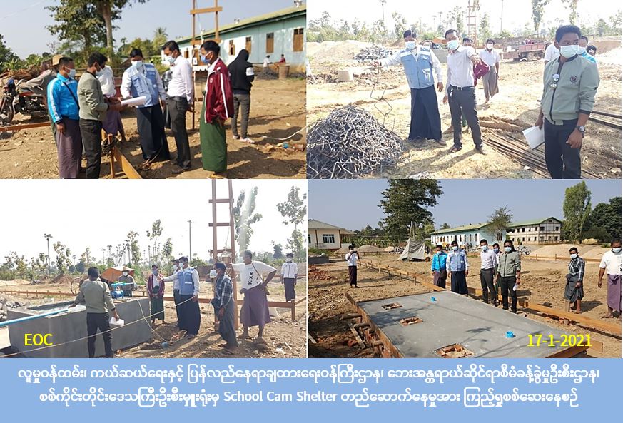 လူမှုူဝန်ထမ်း၊ ကယ်ဆယ်ရေးနှင့် ပြန်လည်နေရာချထားရေးဝန်ကြီးဌာန၊ ဘေးအန္တရယ်ဆိုင်ရာစီမံခန့်ခွဲမှုဦးစီးဌာန၊ စစ်ကိုင်းတိုင်းဒေသကြီးဦးစီးမှူးရုံးမှ တာဝန်ရှိသူများသည် (၁၇-၁-၂၀၂၁) ရက်နေ့တွင် ၂၀၂၀-၂၀၂၁ ဘဏ္ဍာရေးနှစ်၊ အမျိုးသား သဘာဝဘေးအန္တရယ်ဆိုင်ရာစီမံခန့်ခွဲမှုရန်ပုံငွေဖြင့် ယင်းမာပင်ခရိုင်၊ ကနီမြို့နယ်၊ ဇီးဖြူကုန်းကျေးရွာ၊ အထက(ခွဲ) School Cum Shelter တည်ဆောက်မည့် မြေနေရာတွင် Soil Test ဆောင်ရွက်နေမှုနှင့် လုပ်ငန်းအတွက်ကြိုတင်ပြင်ဆင်ဆောင်ရွက်ထားမှု အခြေအနေအား ကျောင်းအုပ်ဆရာကြီး၊ ကျေးရွာမှတာဝန်ရှိသူများ၊ တင်ဒါအောင်ကုမ္ပဏီတို့နှင့်အတူ ကြည့်ရှုစစ်ဆေးမှုဆောင်ရွက်ခဲ့ပါကြောင်း သတင်းရရှိပါသည်။