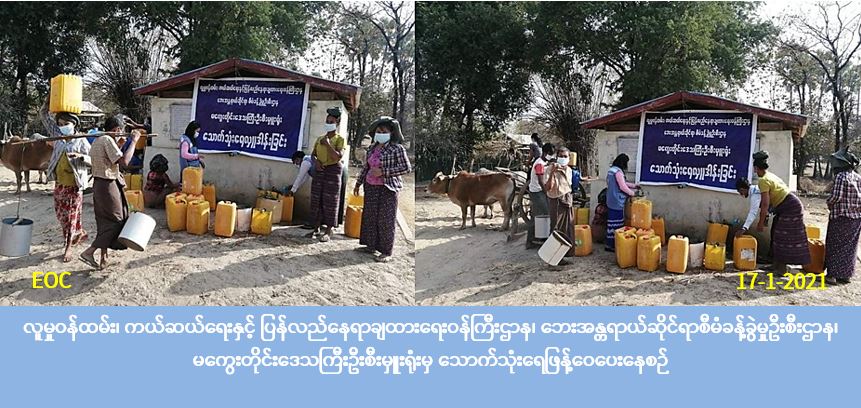 လူမှုဝန်ထမ်း၊ ကယ်ဆယ်ရေးနှင့် ပြန်လည်နေရာချထားရေးဝန်ကြီးဌာန၊ ဘေးအန္တရာယ်ဆိုင်ရာစီမံခန့်ခွဲမှုဦးစီးဌာန၊ မကွေးတိုင်းဒေသကြီးဦးစီးမှူးရုံးမှ တာဝန်ရှိသူများသည် သောက်သုံးရေခက်ခဲသော နတ်မောက်မြို့နယ်၊ တမလန်းပင်ကျေးရွာအုပ်စု၊ အင်တော(ရွာသစ်)ကျေးရွာရှိ အိမ်ခြေ (၁၆၀) လုံး၊ အိမ်ထောင်စု(၁၇၂) စု၊ လူဦးရေ (၈၁၇) ဦးတို့အတွက် သောက်သုံးရေဂါလံ (၆,၀၀၀) အား (၁၇-၁-၂၀၂၁) ရက်နေ့ (၁၁:၃၀) နာရီအချိန်တွင် သွားရောက်ဖြန့်ဝေပေးခဲ့ပါကြောင်း သတင်းရရှိပါသည်။