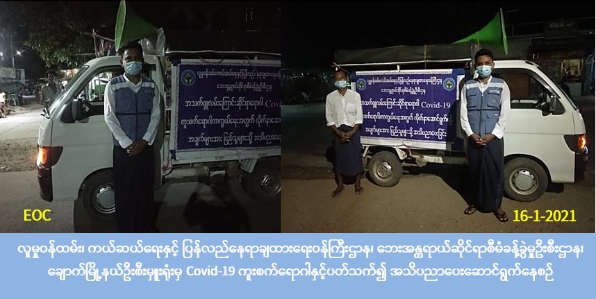 လူမှုဝန်ထမ်း၊ ကယ်ဆယ်ရေးနှင့် ပြန်လည်နေရာချထားရေးဝန်ကြီးဌာန၊ ဘေးအန္တရာယ်ဆိုင်ရာစီမံခန့်ခွဲမှုဦးစီးဌာန၊ ချောက်မြို့နယ်ဦးစီးမှူးရုံးမှ တာဝန်ရှိသူများသည် (၁၆-၁-၂၀၂၁) ရက်နေ့တွင် ချောက်မြို့၊ အမှတ်(၆ ၊ ၇ ၊ ၈ ၊ ၉ ၊ ၁၀) ရပ်ကွက်များနှင့် ရပ်ကွက်ဈေးဆိုင်တို့တွင် COVID-19 ရောဂါနှင့်ပတ်သက်၍ အသိပညာပေးခြင်း၊ Mask များ ဖြန့်ဝေပေးခြင်းတို့ကိုဆောင်ရွက်ခဲ့ပါကြောင်း သတင်းရရှိပါသည်။