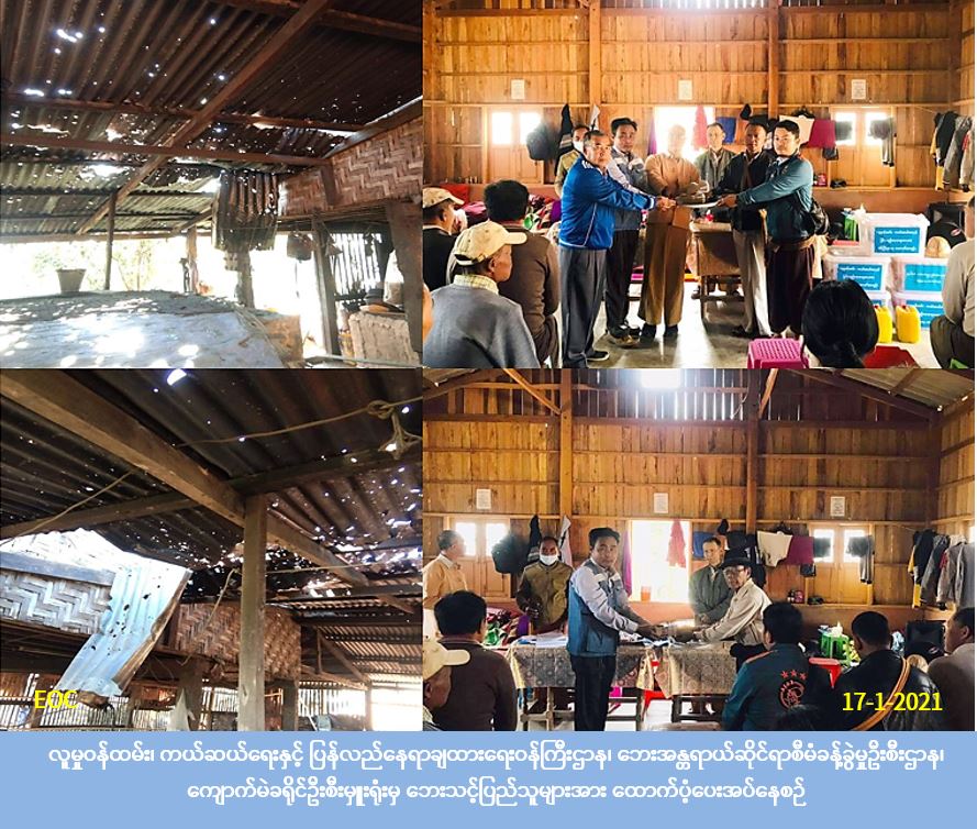 လူမှုဝန်ထမ်း၊ ကယ်ဆယ်ရေးနှင့် ပြန်လည်နေရာချထားရေးဝန်ကြီးဌာန၊ ဘေးအန္တရာယ်ဆိုင်ရာစီမံခန့်ခွဲမှုဦးစီးဌာန၊ ကျောက်မဲခရိုင်ဦးစီးမှူးရုံးမှ တာဝန်ရှိသူများသည် (၆-၁-၂၀၂၁) ရက်နေ့တွင် ကျောက်မဲမြို့နယ်၊ တော့ဆန်ကျေးရွာအုပ်စု၊ တော့ဆန်(ရွာမ)ကျေးရွာ၌ TNLA နှင့် RCSS/SSA လက်နက်ကိုင်အဖွဲ့တို့ ထိတွေ့ဖြစ်ပွားမှုကြောင့် လက်နက်ကြီးကျမှန်၍ တစ်စိတ်တစ်ပိုင်းနှင့် ပြိုကျပျက်စီးခဲ့သောလူနေအိမ်(၆၀)လုံးအတွက် ထောက်ပံ့ငွေ (၅,၇၂၀,၀၀ဝ) ကျပ်နှင့် ပြိုကျပျက်စီးခဲ့သော လူနေအိမ်(၅)လုံးအတွက် ကယ်ဆယ်ရေးပစ္စည်း(၂၁)မျိုးပါ (၅) ပုံး၊ လူဦးရေ(၂၉၇)ဦးအတွက် (၇) ရက်စာ ဆန်ရိက္ခာဖိုးငွေ (၆၂၃,၇၀ဝ) ကျပ်၊ စုစုပေါင်းထောက်ပံ့ငွေ (၆,၃၄၃,၇၀ဝ) ကျပ်အား ဆရာတော်များ၊ ပြည်နယ်လွှတ်တော်ကိုယ်စားလှယ်များနှင့်အတူ (၁၇-၁-၂၀၂၁) ရက်နေ့ (၁၁:၄၅) နာရီအချိန်တွင် တော့ဆန်ကျေးရွာ ဘုန်းတော်ကြီးကျောင်း၌ ပြည်သူများ လက်ဝယ်အရောက်ထောက်ပံ့ ပေးအပ်ခဲ့ပါကြောင်း သတင်းရရှိပါသည်။