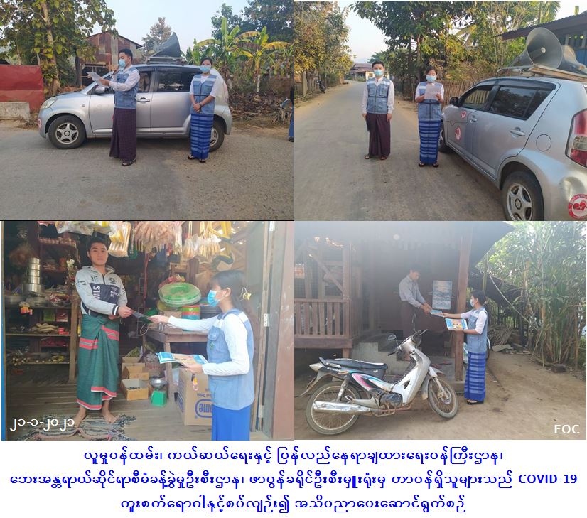 လူမှုဝန်ထမ်း၊ ကယ်ဆယ်ရေးနှင့် ပြန်လည်နေရာချထားရေးဝန်ကြီးဌာန၊ ဘေးအန္တရာယ်ဆိုင်ရာစီမံခန့်ခွဲမှုဦးစီးဌာန၊ ဖာပွန်ခရိုင်ဦးစီးမှူးရုံးမှ တာဝန်ရှိသူများသည် (၂၁-၁-၂၀၂၁) ရက်နေ့၊ နံနက်(၀၈:၀၀)နာရီအချိန်မှ (၁၁:၀၀)နာရီအချိန်ထိ ဖာပွန်ခရိုင်၊ ဖာပွန်မြို့အတွင်းရှိ ဆင်စွယ်ကျေးရွာ၊ ဘလဲ့ပုံကျေးရွာ၊ ပိုမာတဲကျေးရွာနှင့် သိန်းချောင်းကျေးရွာများ၌ COVID-19 ကူးစက်မြန်ရောဂါပြန့်ပွားမှုများ မဖြစ်ပွားစေရန် သိရှိလိုက်နာရမည့်အချက်များနှင့် သဘာဝဘေးအန္တရာယ်များနှင့်စပ်လျဉ်း၍ ဆောင်ရန်/ရှောင်ရန်အချက်များအား အသံချဲ့စက်ဖြင့်အသိပညာပေးဆောင်ရွက်ခဲ့ပြီး လက်ကမ်းစာစောင်များ ဖြန့်ဝေပေးခဲ့ကြောင်း သတင်းရရှိပါသည်။