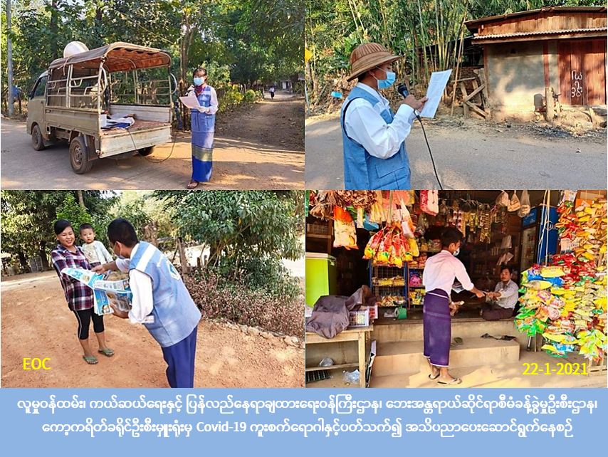 လူမှုဝန်ထမ်း၊ ကယ်ဆယ်ရေးနှင့် ပြန်လည်နေရာချထားရေးဝန်ကြီးဌာန၊ ဘေးအန္တရာယ်ဆိုင်ရာစီမံခန့်ခွဲမှုဦးစီးဌာန၊ ကော့ကရိတ်ခရိုင်ဦးစီးမှူးရုံးမှ တာဝန်ရှိသူများသည် (၂၂-၁-၂၀၂၁) ရက်နေ့၊ နံနက် (၀၈:၀၀) နာရီချိန်မှ နေ့လည် (၁၁:၀၀) နာရီချိန်ထိ ကော့ကရိတ်မြို့နယ်အတွင်းရှိ အမှတ်(၁)ရပ်ကွက်၊ ကမိုင်ကုန်းကျေးရွာနှင့် ကြောင်ရှာကုန်းကျေးရွာတို့၌ Covid-19 ကူးစက်မြန်ရောဂါ ကြိုတင်ကာကွယ်ရေးနှင့်ပတ်သက်၍ ဆောင်ရန်/ ရှောင်ရန် အချက်များအား အသံချဲ့စက်ဖြင့် ပြည်သူလူထုအတွင်း အသိပညာပေးဆောင်ရွက်ခဲ့ပြီး Mask နှင့် လက်ကမ်းစာစောင်များ ဖြန့်ဝေပေးခြင်းတို့ကိုလည်း ဆောင်ရွက်ခဲ့ပါကြောင်း သတင်းရရှိပါသည်။