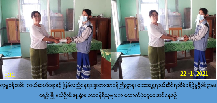 လူမှုဝန်ထမ်း၊ ကယ်ဆယ်ရေးနှင့် ပြန်လည်နေရာချထားရေးဝန်ကြီးဌာန၊ ဘေးအန္တရာယ် ဆိုင်ရာစီမံခန့်ခွဲမှုဦးစီးဌာန၊ ရေဦးမြို့နယ်ဦးစီးမှူးရုံးမှ တာဝန်ရှိသူများသည် တန့်ဆည်မြို့ နယ်၊ ကံထူးမအုပ်စု၊ အင်ရေအိုးကျေးရွာအနီးတွင် (၂၁-၁-၂၀၂၁) ရက်နေ့တွင် ကားတစ်စီး နှင့်တစ်စီး ဆီဘောက်ဆာအချင်းချင်း ဒီဇယ်ဆီခွဲထည့်စဥ် ဆီပိုက်ပြုတ်ထွက်ပြီး မြေပြင် ပေါ်သို့ ဆီများကျဆင်းသဖြင့် အပူချိန်ဖိအားကြောင့် မီးစတင်လောင်ကျွမ်းခြင်း ဖြစ်ပွားခဲ့ ပြီး မီးဘေးကြောင့် ဒဏ်ရာရရှိခဲ့သည့် လူဦးရေ (၂) ဦးအတွက် (၁) ဦးလျှင် (၅၀,၀၀ဝ/-) ကျပ်နှုန်းဖြင့် စုစုပေါင်းထောက်ပံငွေ (၁၀၀,၀၀ဝ/-) ကျပ်အား (၂၂-၁-၂၀၂၁) ရက်နေ့၊ (၁၄:ဝဝ)နာရီအချိန်တွင် တန့်ဆည်မြို့နယ်သို့သွားရောက် ကူညီထောက်ပံ့ပေးအပ်ခဲ့ပါ ကြောင်း သတင်းရရှိပါသည်။