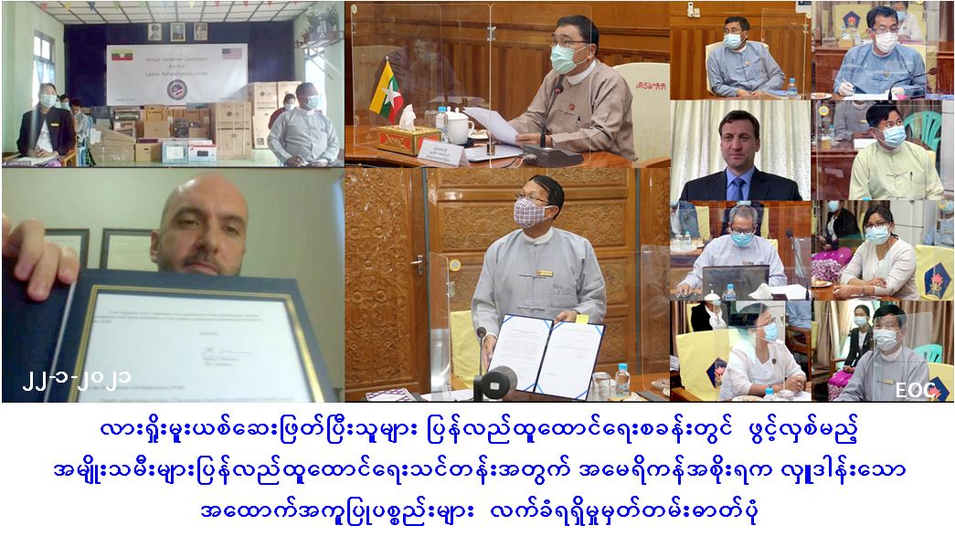 လားရှိုးမူးယစ်ဆေးဖြတ်ပြီးသူများ ပြန်လည်ထူထောင်ရေးစခန်းတွင်ဖွင့်လှစ်မည့် အမျိုးသမီးများပြန်လည်ထူထောင်ရေးသင်တန်းအတွက် လိုအပ်သော အထောက်အကူပြုပစ္စည်းများကို မြန်မာနိုင်ငံဆိုင်ရာအမေရိကန်နိုင်ငံသံအမတ်ကြီးက လူမှုဝန်ထမ်း၊ ကယ်ဆယ်ရေးနှင့် ပြန်လည်နေရာချထားရေးဝန်ကြီးဌာနသို့ လွှဲပြောင်းပေးအပ်ပွဲအခမ်းအနားကို ယနေ့မွန်းလွဲပိုင်း၌ အဆိုပါဝန်ကြီးဌာနတွင် Virtual Meeting ဖြင့် ကျင်းပရာ ပြည်ထောင်စုဝန်ကြီးဒေါက်တာဝင်းမြတ်အေး တက်ရောက်ခဲ့ပါသည်။