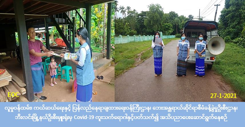 လူမှုဝန်ထမ်း၊ ကယ်ဆယ်ရေးနှင့် ပြန်လည်နေရာချထားရေး ဝန်ကြီးဌာန၊ ဘေးအန္တရာယ်ဆိုင်ရာစီမံခန့်ခွဲမှုဉီးစီးဌာန၊ ဘီးလင်းမြို့နယ်ဦးစီးမှူးရုံးမှ တာဝန်ရှိသူများသည် (၂၇-၁-၂၀၂၁) ရက်နေ့၊ (၀၈:၀၀) အချိန်မှ (၁၂:၀၀)အချိန်ထိ မွန်ပြည်နယ်၊ သထုံခရိုင်၊ ဘီးလင်းမြို့နယ်၊ ရွှေရောင်ပြကျေးရွာအုပ်စုအတွင်းရှိ ရွှေရောင်ပြကျေးရွာ၊ အဝင်းကြီးကျေးရွာနှင့် မိကျောင်းအင်းကျေးရွာတို့တွင် Covid-19 ရောဂါ ကူးစက်ပျံ့နှံ့မှုများမဖြစ်ပွားစေရေး အသိပညာပေးခြင်းလုပ်ငန်းများအား အသံချဲ့စက်ဖြင့် လိုက်လံအသိပေးကြေညာခဲ့ပြီး လက်ကမ်းစာစောင်များ ဝေငှခဲ့ပါကြောင်း သတင်းရရှိပါသည်။