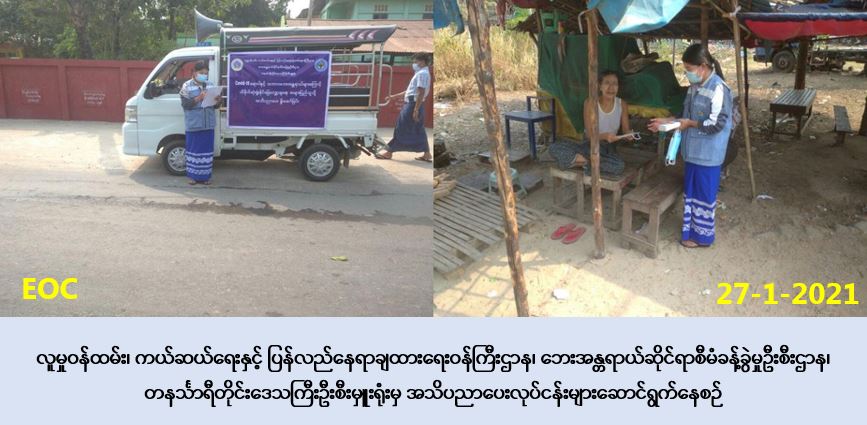 လူမှုဝန်ထမ်း၊ ကယ်ဆယ်ရေးနှင့် ပြန်လည်နေရာချထားရေးဝန်ကြီးဌာန၊ ဘေးအန္တရာယ်ဆိုင်ရာ စီမံခန့်ခွဲမှုဦးစီးဌာန၊ တနင်္သာရီတိုင်းဒေသကြီးဦးစီးမှူးရုံးမှ တာဝန်ရှိသူများသည် (၂၇-၁-၂၀၂၁) ရက်နေ့၌ ထားဝယ်မြို့နယ် ကြက်စားပြင်ရပ်ကွက်နှင့် ဘုမ္မော်ရပ်ကွက်တို့တွင် ကျန်းမာရေးနှင့် အားကစားဝန်ကြီးဌာနမှ ထုတ်ပြန်ထားသော Covid-19 ကူးစက်မှုမဖြစ်စေရန် အသိပညာပေးခြင်း၊ ရာသီအလိုက်ဖြစ်ပွားတတ်သော သဘာဝဘေးအန္တရာယ်များနှင့် ပတ်သက်သည့် ဆောင်ရန်/ရှောင်ရန်များအား အသိပညာပေးခြင်း၊ Maskများဝေငှပေးခြင်းနှင့် သဘာဝဘေးအသိပညာပေးလက်ကမ်းစာစောင်များဝေငှခြင်းများပြုလုပ်ဆောင်ရွက်ခဲ့ကြောင်း သတင်းရရှိပါသည်။