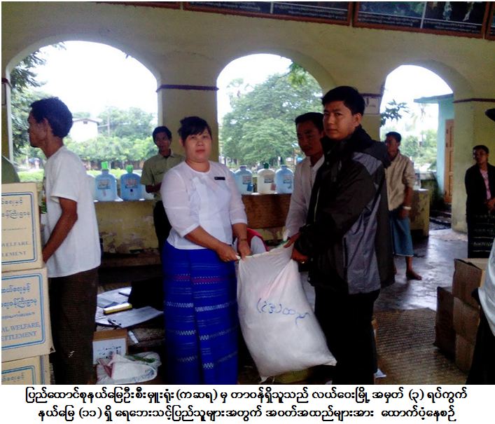 လယ်ဝေးမြို့ အမှတ် (၃) ရပ်ကွက်နယ်မြေ (၁၁) ရှိ ရေဘေးသင့်အိမ်ထောင်စု (၃၆) စုအတွက် ကယ်ဆယ်ရေးပစ္စည်း (၄) မျိုး ရေသန့်ဆေး အာဟာရမှုန့်၊ အဝတ်အထည်များအား (၁၂.၉.၂၀၁၆) နေ့တွင် ပြည်ထောင်စုနယ်မြေဦးစီးမှူးရုံးမှ လယ်ဝေးမြို့ ဖောင်တော်ချက်မ ကယ်ဆယ်ရေးစခန်းသို့သွားရောက်ထောက်ပံ့ပေးခဲ့ကြောင်း သိရှိရပါသည်။