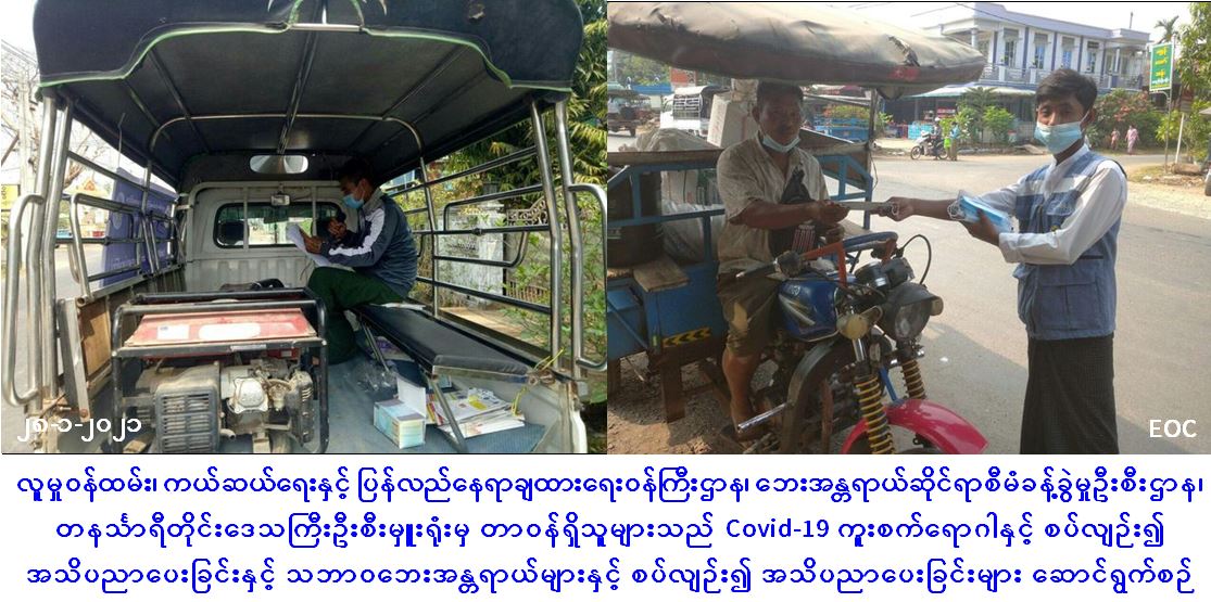 လူမှုဝန်ထမ်း၊ ကယ်ဆယ်ရေးနှင့် ပြန်လည်နေရာချထားရေးဝန်ကြီးဌာန၊ ဘေးအန္တရာယ်ဆိုင်ရာစီမံခန့်ခွဲမှုဦးစီးဌာန၊ တနင်္သာရီတိုင်းဒေသကြီးဦးစီးမှူးရုံးမှ တာဝန်ရှိသူများသည် (၂၈-၁-၂၀၂၁)ရက်နေ့တွင် ထားဝယ်မြို့နယ်၊ ဝဲကျွန်းရပ်ကွက်နှင့် ဆင်ဆိပ်ရပ်ကွက်များအတွင်း ကျန်းမာရေးနှင့်အားကစားဝန်ကြီးဌာနမှ ထုတ်ပြန်ထားသော Covid-19 ကူးစက်ရောဂါနှင့်စပ်လျဉ်းသည့် အသိပညာပေးပန်ကြားချက်များနှင့် ရာသီအလိုက်ဖြစ်ပွားတတ်သော သဘာဝဘေးအန္တရာယ်များနှင့်ပတ်သက်သည့် ဆောင်ရန်/ရှောင်ရန်များအား အသိပညာပေးခြင်း၊ Maskများ ဝေငှပေးခြင်းနှင့် သဘာဝဘေးအသိပညာပေးလက်ကမ်းစာစောင်များ ဝေငှခြင်းများ ပြုလုပ်ဆောင်ရွက်ခဲ့ကြောင်း သတင်းရရှိပါသည်။