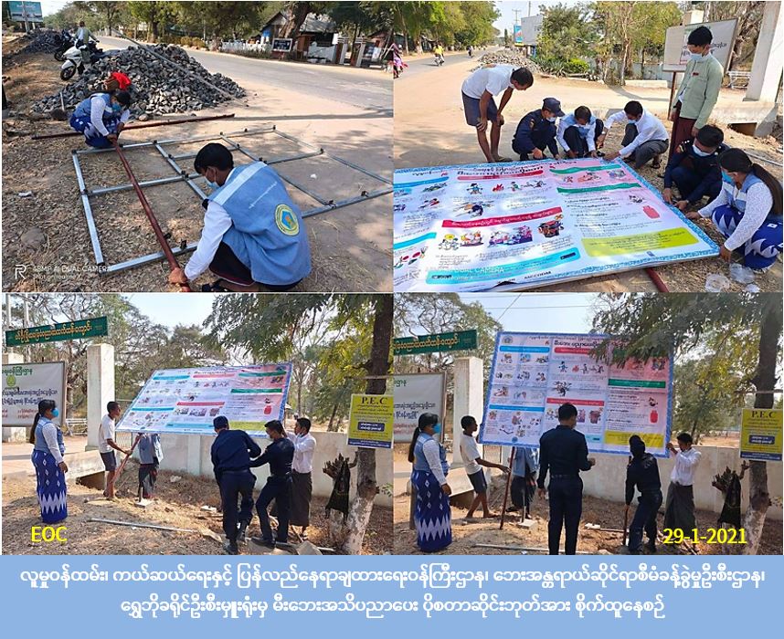 လူမှုဝန်ထမ်း၊ ကယ်ဆယ်ရေးနှင့် ပြန်လည်နေရာချထားရေးဝန်ကြီးဌာန၊ ဘေးအန္တရာယ်ဆိုင်ရာစီမံခန့်ခွဲမှုဦးစီးဌာန၊ ရွှေဘိုခရိုင်ဦးစီးမှူးရုံးမှ တာဝန်ရှိသူများသည် (၂၉-၁-၂၀၂၁) ရက်နေ့၌ ခင်ဦးမြို့နယ်အတွင်းရှိ မိဘပြည်သူများ မီးဘေးအန္တရာယ်နှင့်ပတ်သက်၍ ဆောင်ရန်/ရှောင်ရန်အချက်များ သိရှိနိုင်စေရန်အတွက် ခင်ဦးမြို့မရဲစခန်းနှင့်မျက်နှာချင်းဆိုင် အထက်တန်းကျောင်းရှေ့တွင် (၉ x ၆) ပေ မီးဘေးအသိပညာပေး ပိုစတာဆိုင်းဘုတ်အား စိုက်ထူခဲ့ပါကြောင်း သတင်းရရှိပါသည်။