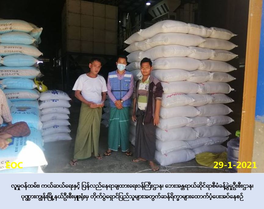 လူမှုဝန်ထမ်း၊ ကယ်ဆယ်ရေးနှင့် ပြန်လည်နေရာချထားရေးဝန်ကြီးဌာန၊ ဘေးအန္တရာယ်ဆိုင်ရာ စီမံခန့်ခွဲမှုဦးစီးဌာန၊ ပုဏ္ဏားကျွန်းမြို့နယ်ဦးစီးမှူးရုံးမှ တာဝန်ရှိသူများသည် (၂၉-၁-၂၀၂၁) ရက်နေ့တွင် ပုဏ္ဏားကျွန်းမြို့နယ်၊ သြရမကျေးရွာ(ဘုန်းကြီးကျောင်း)ရှိ တိုက်ပွဲရှောင်အိမ်ထောင်စု(၇၁)စု၊ လူဦးရေ(၂၆၈)ဦး တို့အတွက် ဆန်ရိက္ခာ(၁)လစာ ဆန်(၈၃)အိတ်၊(၁၈)ပြည်နှင့် ခွေးသေကျေးရွာ (ဘုန်းကြီးကျောင်း)ရှိ တိုက်ပွဲရှောင် အိမ်ထောင်စု(၁၉)စု၊လူဦးရေ(၉၄)ဦးတို့အတွက် ဆန်(၂၉) အိတ်၊ (၉)ပြည်တို့အား ပုဏ္ဏားကျွန်းမြို့နယ်ဦးစီးမှူးရုံးမှ စခန်းတာဝန်ခံများလက်ဝယ်အရောက် သွားရောက်ထောက်ပံ့ ခဲ့ကြောင်းသတင်းရရှိပါသည်။