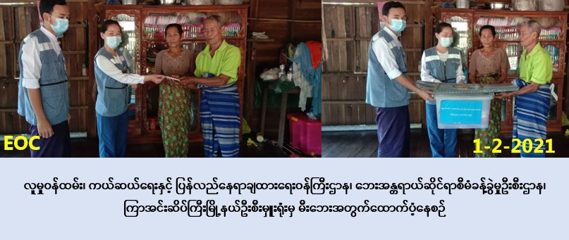 လူမှုဝန်ထမ်း၊ ကယ်ဆယ်ရေးနှင့် ပြန်လည်နေရာချထားရေးဝန်ကြီးဌာန၊ ဘေးအန္တရာယ်ဆိုင်ရာ စီမံခန့်ခွဲမှုဦးစီးဌာန၊ ကြာအင်းဆိပ်ကြီးမြို့နယ်စီးမှူးရုံးမှ တာဝန်ရှိသူများသည် (၁-၂-၂၀၂၁) ရက်နေ့၌ ဘုရားသုံးဆူမြို့နယ်၊ ဖားပြကျေးရွာအုပ်စု၊ ဆိပ်ဖူးကုန်းရပ်တွင် ဖြစ်ပွားခဲ့သော မီးဘေးကြောင့် ပျက်စီးဆုံးရှုံးခဲ့သည့် နေအိမ်(၁)လုံး၊ အိမ်ထောင်စု(၁)စုအတွက် ကယ်ဆယ်ရေးပစ္စည်း (၁၆)မျိုး၊ ဘေးသင့်လူဦးရေ(၅)ဦးအတွက် ဆန်ရိက္ခာ(၇)ရက်စာ (၁၀,၅၀၀/-) ကျပ်နှင့် အိမ်ဆောက်ပစ္စည်းဖိုးထောက်ပံ့ငွေ (၁၀,၀၀၀၀/-)ကျပ်တို့အား (၁-၂-၂၀၂၁) ရက်နေ့၊ နံနက်(၁၁းဝ၀)နာရီအချိန်တွင် ဖားပြအုပ်ချုပ်ရေးမှူးတို့နှင့်အတူ ဘေးသင့်ပြည်သူထံသို့ လက်ဝယ်အရောက်သွားရောက် ထောက်ပံ့ပေးအပ်ခဲ့ပါကြောင်း သတင်းရရှိပါသည်။