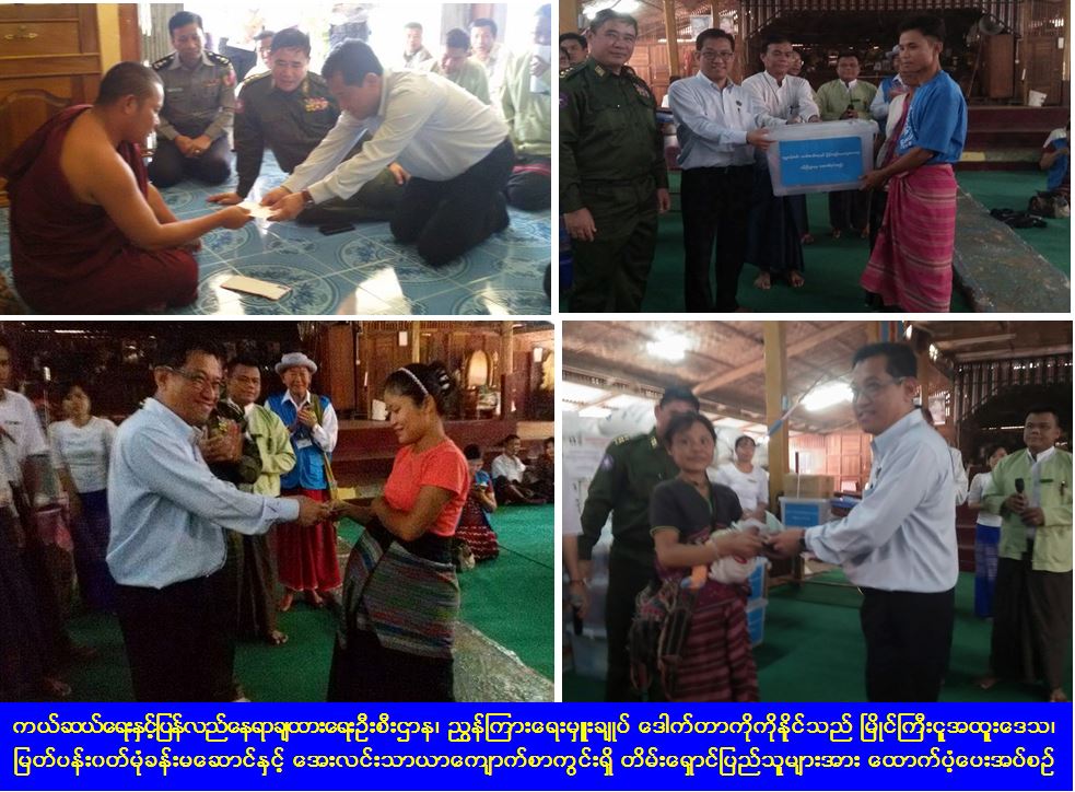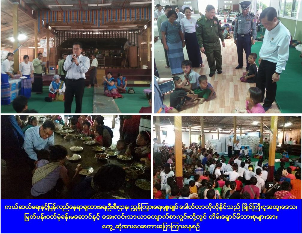 လူမှုဝန်ထမ်း၊ ကယ်ဆယ်ရေးနှင့်ပြန်လည်နေရာချထားရေးဝန်ကြီးဌာနသည် ကရင်ပြည်နယ် အစိုးရအဖွဲ့နှင့်အတူ ပူးပေါင်း၍ မဲသဝေါဒေသရှိ ကျေးရွာများမှ မြိုင်ကြီးငူအထူးဒေသသို့ တိမ်းရှောင်ရောက်ရှိလာသူများအား ကူညီ ထောက်ပံ့မှုများ ဆောင်ရွက်လျက်ရှိရာ (၁၃-၉-၂၀၁၆)နေ့တွင် ကရင်ပြည်နယ်အစိုးရအဖွဲ့မှ လုံခြုံရေးနှင့်နယ်စပ်ရေးရာ၀န်ကြီး၊ လူမှုရေး၀န်ကြီး၊ ဗမာတိုင်းရင်းသားလူမျိုးရေးရာ၀န်ကြီးတို့နှင့်အတူ ကယ်ဆယ်ရေးနှင့်ပြန်လည်နေရာချထားရေးဦးစီးဌာန၊ ညွှန်ကြားရေးမှူးချုပ် ဒေါက်တာကိုကိုနိုင်သည် မြိုင်ကြီးငူအထူးဒေသ၊ မြတ်ပန်း၀တ်မုံခန်းမဆောင်နှင့် အေးလင်းသာယာကျောက်စာကွင်းတို့တွင် တိမ်းရှောင် မိသားစုများနှင့် တွေ့ဆုံအားပေးစကားပြောကြားပြီးနောက် မိသားစု(၆၆၅)စု၊ လူဦးရေ (၃၈၁၃)ဦးတို့အတွက် လူမှုဝန်ထမ်း၊ ကယ်ဆယ်ရေးနှင့်ပြန်လည်နေရာချထားရေးဝန်ကြီးဌာနမှ ထောက်ပံ့ကူညီသော ဆန်(၁၈၀)အိတ်၊ စားဆီ(၂၇၂)ပိဿာ၊ တာပေါ်လင်လိပ်(၆)လိပ် တို့ကို ထောက်ပံ့ပေးခဲ့ပြီး လူမှုကာကွယ်စောင့်ရှောက်ရေးအနေဖြင့် ကိုယ်၀န်ဆောင်မိခင်များနှင့် အသက်(၂)နှစ်အောက်ရင်သွေးငယ်ရှိ နို့တိုက်မိခင်များအတွက် (၁)ဦးလျှင်(၂၀၀၀၀/-) နှုန်းဖြင့် ထောက်ပံ့ငွေများကိုလည်းပေးအပ်ခဲ့ကြောင်းနှင့် လိုအပ်သည်များ ဆက်လက် ထောက်ပံ့ကူညီသွားမည် ဖြစ်ကြောင်း သိရှိရပါသည်။